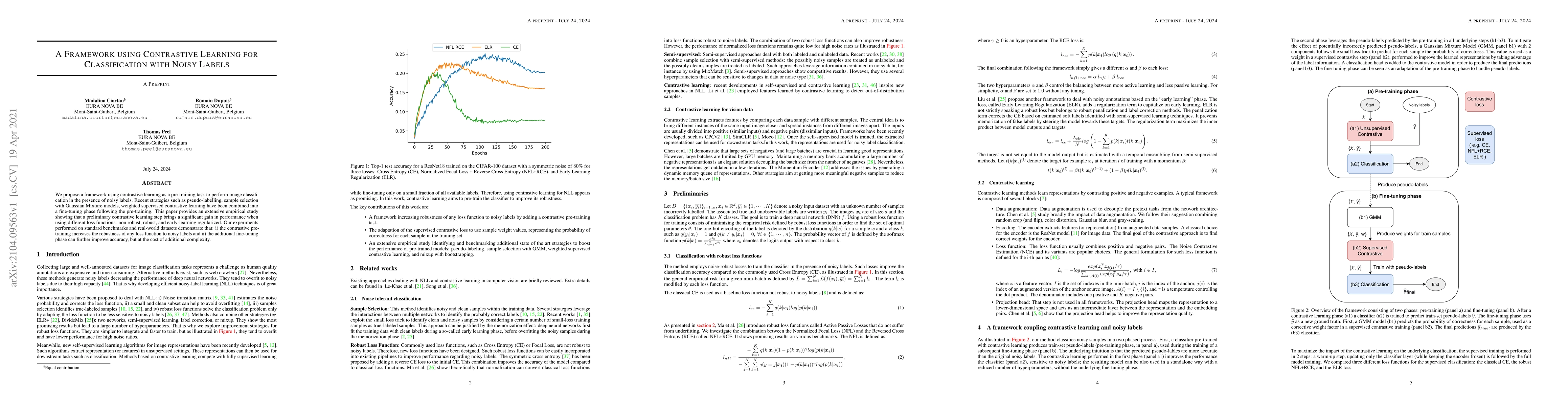 This paper proposes a framework using contrastive learning to pre-train models for image classification under noisy labels, showing significant performance gains. The contrastive pre-training enhances robustness to noisy labels, and subsequent fine-tuning can further improve accuracy, albeit with increased complexity.