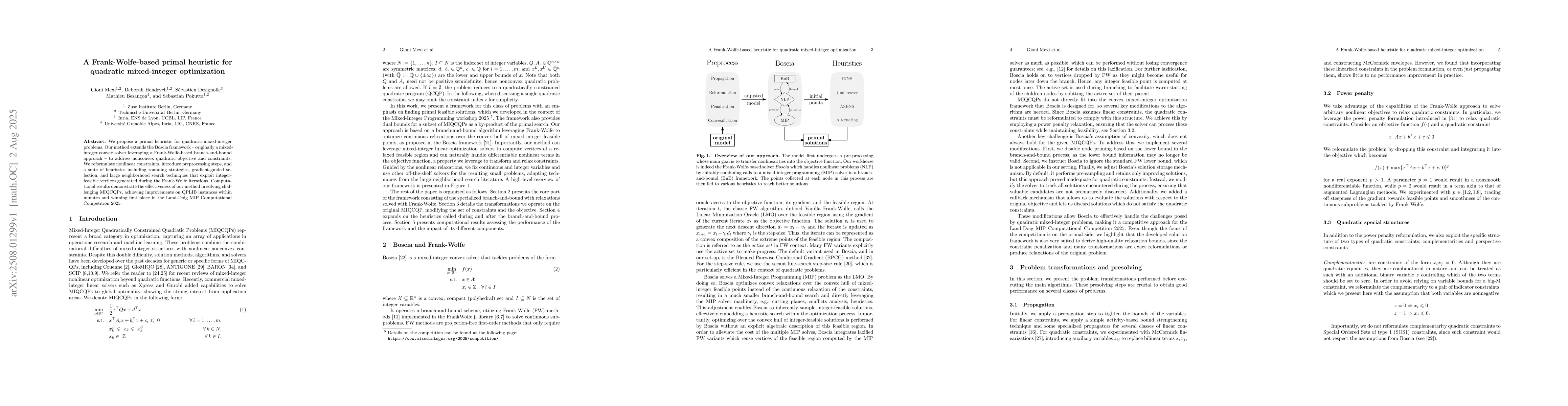 We propose a primal heuristic for quadratic mixed-integer problems. Our method extends the Boscia framework -- originally a mixed-integer convex solver leveraging a Frank-Wolfe-based branch-and-bound approach -- to address nonconvex quadratic objective and constraints. We reformulate nonlinear constraints, introduce preprocessing steps, and a suite of heuristics including rounding strategies, gradient-guided selection, and large neighborhood search techniques that exploit integer-feasible vertices generated during the Frank-Wolfe iterations. Computational results demonstrate the effectiveness of our method in solving challenging MIQCQPs, achieving improvements on QPLIB instances within minutes and winning first place in the Land-Doig MIP Computational Competition 2025.