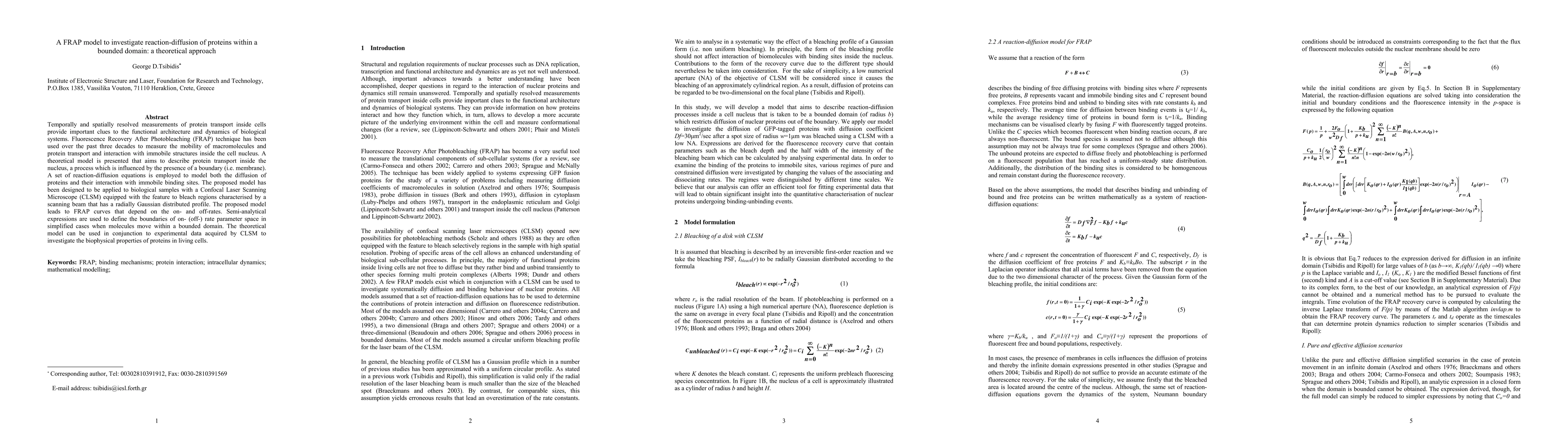 Temporally and spatially resolved measurements of protein transport inside cells provide important clues to the functional architecture and dynamics of biological systems. Fluorescence Recovery After Photobleaching (FRAP) technique has been used over the past three decades to measure the mobility of macromolecules and protein transport and interaction with immobile structures inside the cell nucleus. A theoretical model is presented that aims to describe protein transport inside the nucleus, a process which is influenced by the presence of a boundary (i.e. membrane). A set of reaction-diffusion equations is employed to model both the diffusion of proteins and their interaction with immobile binding sites. The proposed model has been designed to be applied to biological samples with a Confocal Laser Scanning Microscope (CLSM) equipped with the feature to bleach regions characterised by a scanning beam that has a radially Gaussian distributed profile. The proposed model leads to FRAP curves that depend on the on- and off-rates. Semi-analytical expressions are used to define the boundaries of on- (off-) rate parameter space in simplified cases when molecules move within a bounded domain. The theoretical model can be used in conjunction to experimental data acquired by CLSM to investigate the biophysical properties of proteins in living cells.