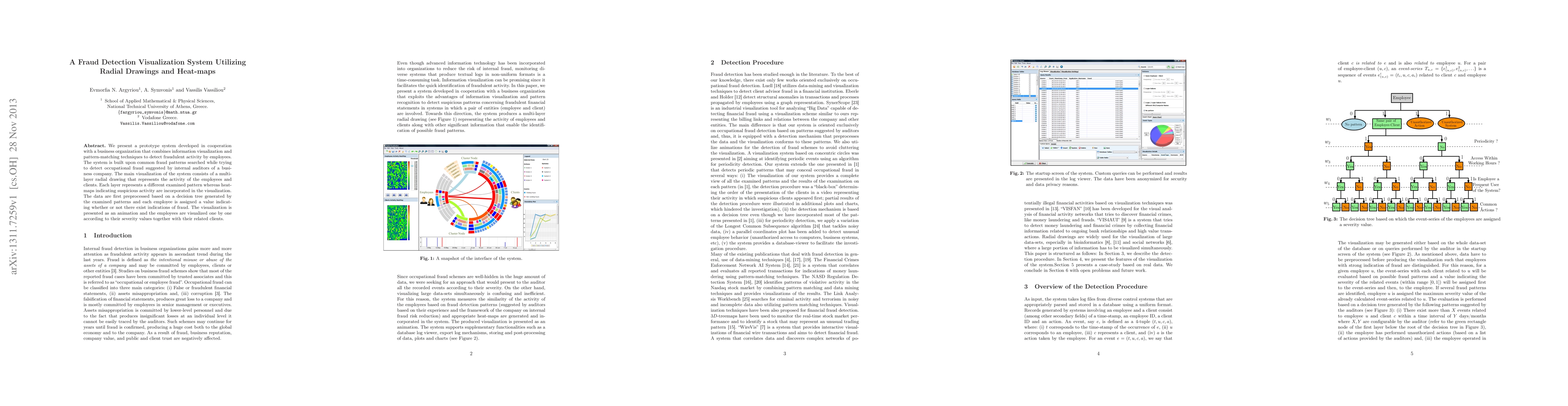 This paper introduces a fraud detection system that uses radial drawings and heat-maps to visualize employee activity patterns and identify potential fraud. The system employs a multi-layer radial visualization and animations to highlight suspicious activity based on preprocessed data and decision trees.