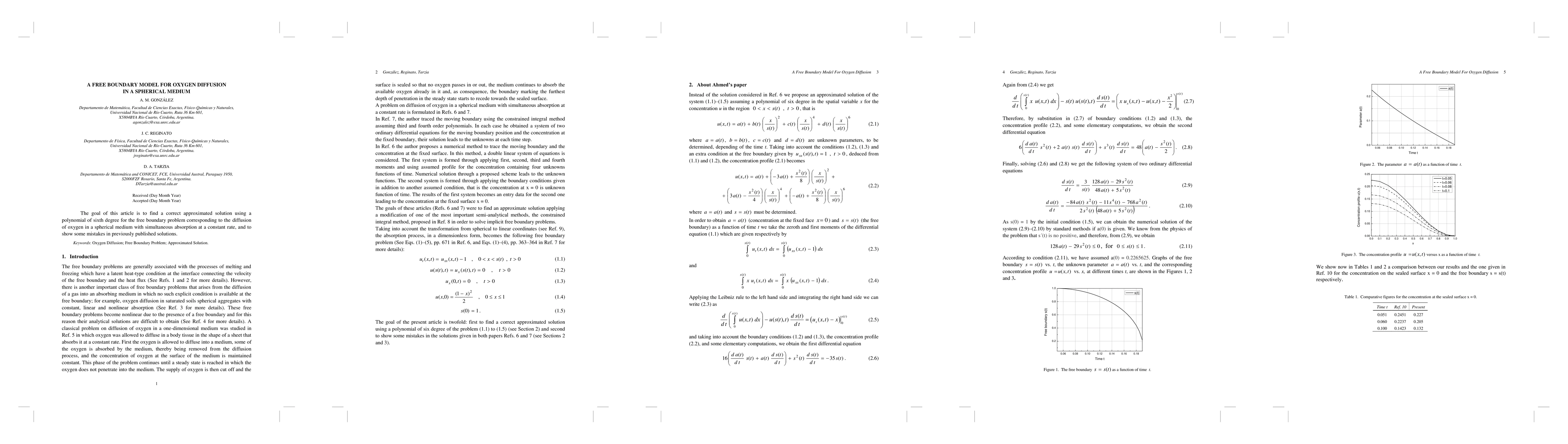 The goal of this article is to find a correct approximated solution using a polynomial of sixth degree for the free boundary problem corresponding to the diffusion of oxygen in a spherical medium with simultaneous absorption at a constant rate, and to show some mistakes in previously published solutions.