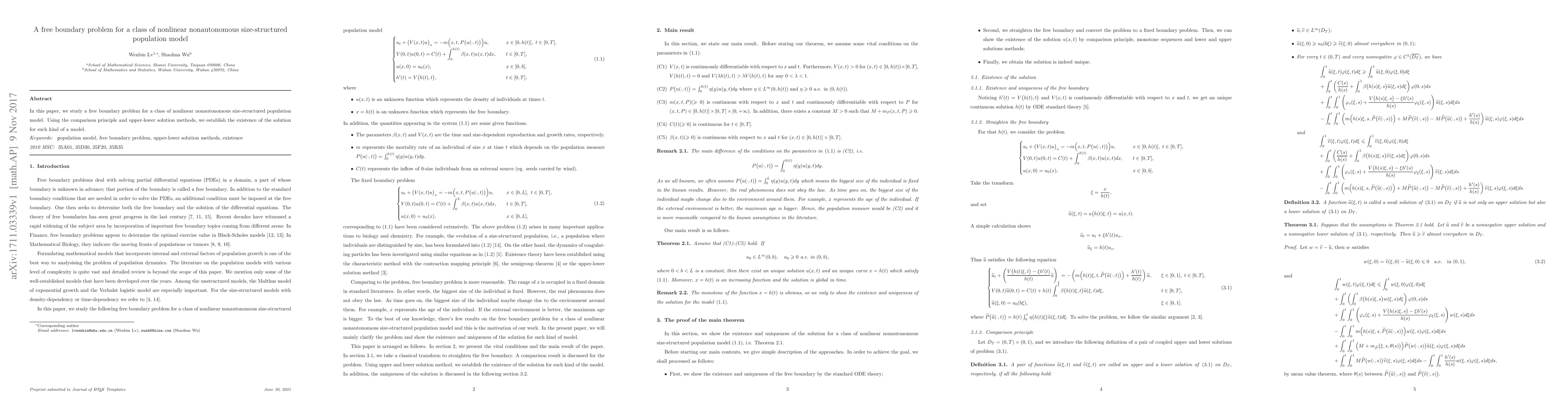 Summary: This paper investigates a free boundary problem for nonlinear nonautonomous size-structured population models, establishing solution existence through the comparison principle and upper lower solution methods.