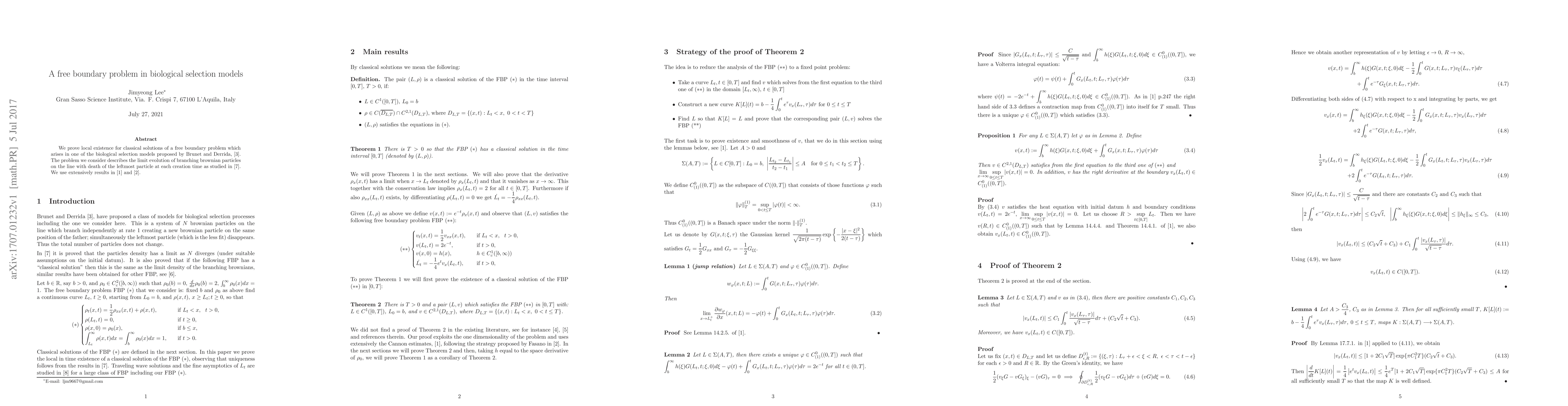 Researchers prove local existence of solutions to a free boundary problem in biological selection models, which describe the evolution of branching particles on a line.