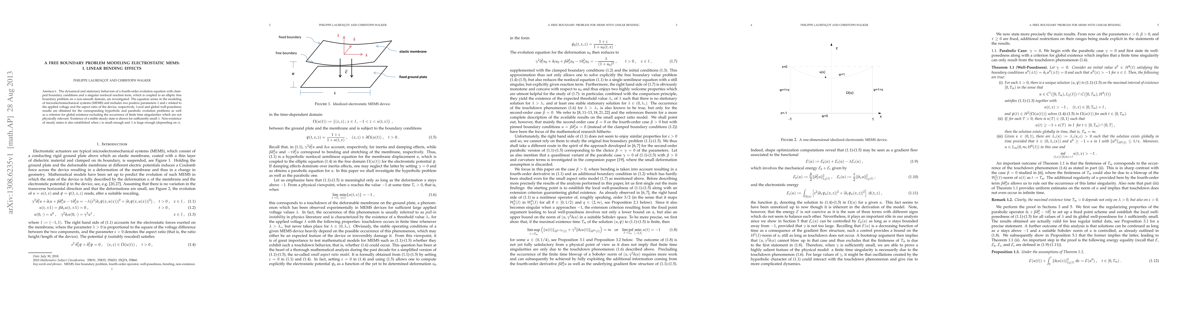 This paper investigates the dynamical and stationary behaviors of a fourth-order evolution equation modeling electrostatic MEMS, focusing on linear bending effects. It establishes local and global well-posedness results and criteria for global existence, proving the existence of stable steady states for small applied voltage while showing non-existence for large voltage and small aspect ratio.