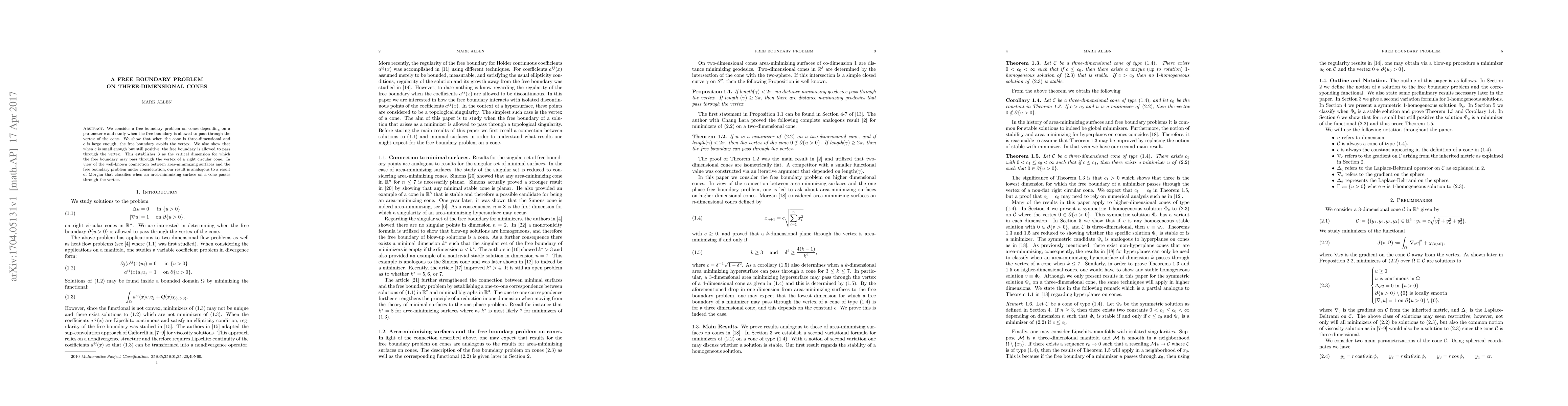 Researchers studied a free boundary problem on three-dimensional cones and found that in 3 dimensions, when c is large enough, the free boundary avoids the vertex, but for lower values of c, it passes through the vertex.