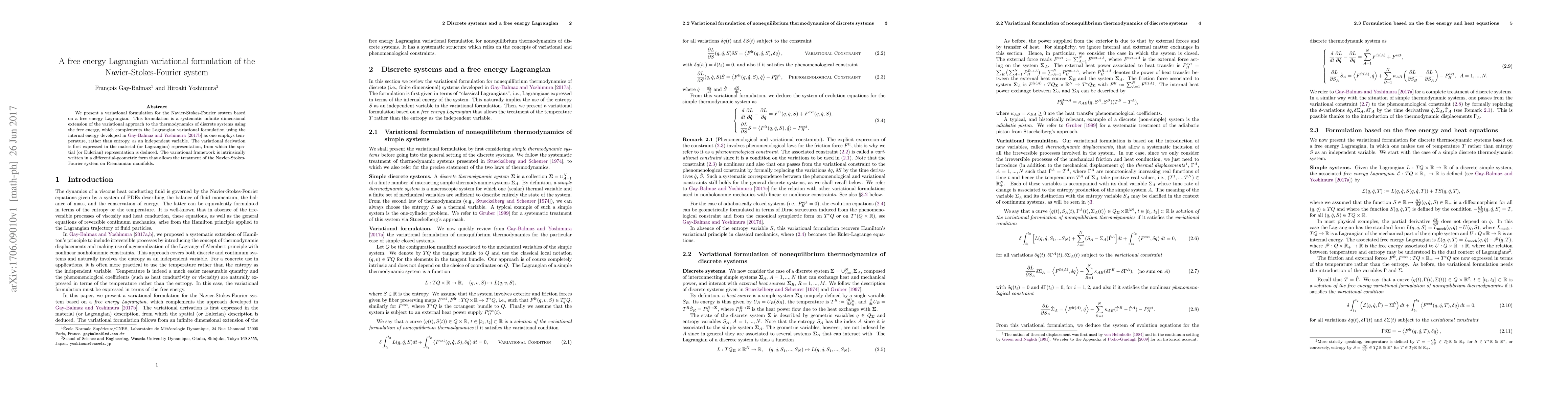 This paper introduces a variational formulation for the Navier-Stokes-Fourier system using a free energy Lagrangian, extending the approach to infinite dimensions and complementing previous work using internal energy. The framework is expressed in differential geometry, enabling its application to Riemannian manifolds.