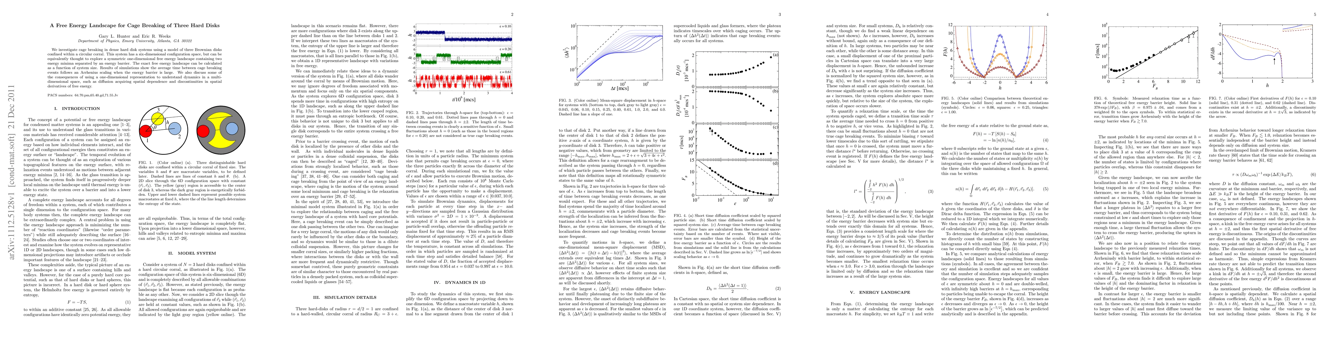 This paper investigates cage breaking in dense hard disk systems through a model of three Brownian disks, revealing a one-dimensional free energy landscape with two minima separated by a barrier. The study finds that the average time between cage breaking events scales Arrhenius-like when the barrier is large, and discusses implications of this simplified representation for dynamics in higher dimensional spaces.