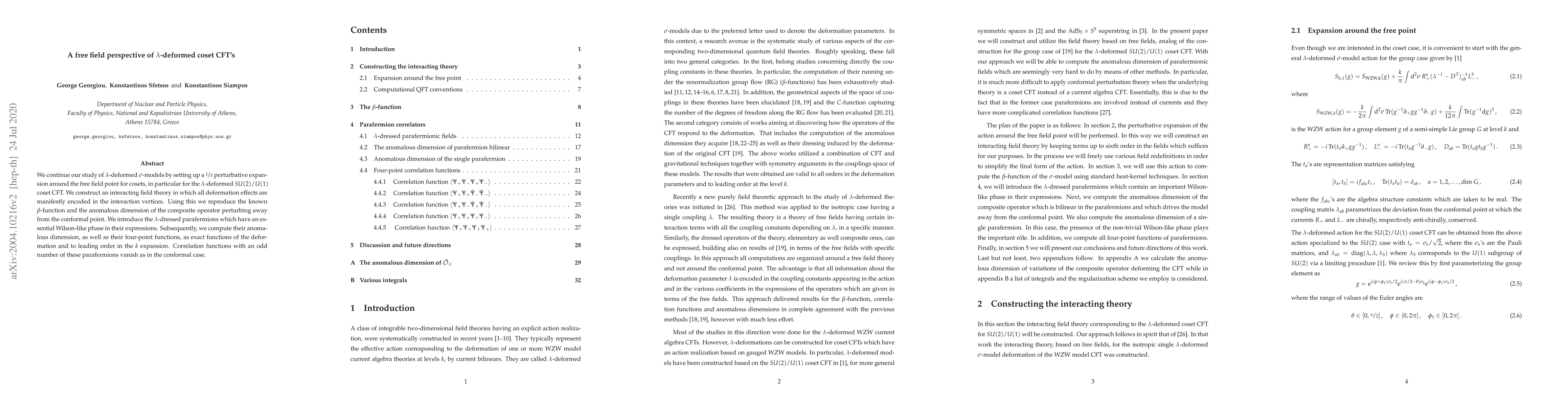 We continue our study of $\lambda$-deformed $\sigma$-models by setting up a $1/k$ perturbative expansion around the free field point for cosets, in particular for the $\lambda$-deformed $SU(2)/U(1)$ coset CFT. We construct an interacting field theory in which all deformation effects are manifestly encoded in the interaction vertices. Using this we reproduce the known $\beta$-function and the anomalous dimension of the composite operator perturbing away from the conformal point. We introduce the $\lambda$-dressed parafermions which have an essential Wilson-like phase in their expressions. Subsequently, we compute their anomalous dimension, as well as their four-point functions, as exact functions of the deformation and to leading order in the $k$ expansion. Correlation functions with an odd number of these parafermions vanish as in the conformal case.
