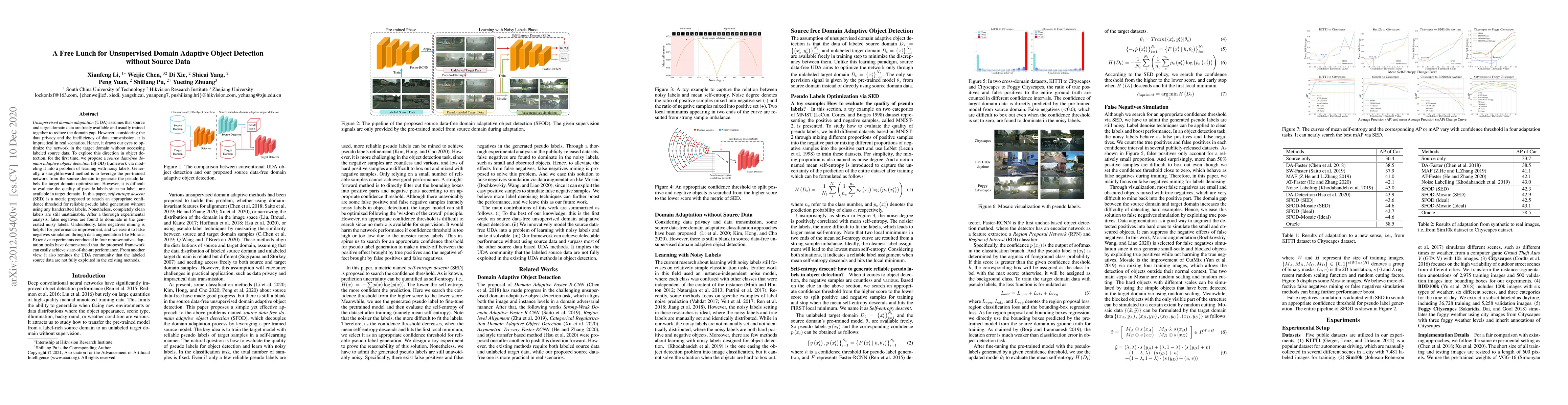 This paper proposes a source data-free domain adaptive object detection framework (SFOD) that leverages self-entropy descent (SED) to generate reliable pseudo labels without labeled source data. The method addresses false negatives in pseudo labels through data augmentation techniques, achieving state-of-the-art performance in four adaptation tasks.