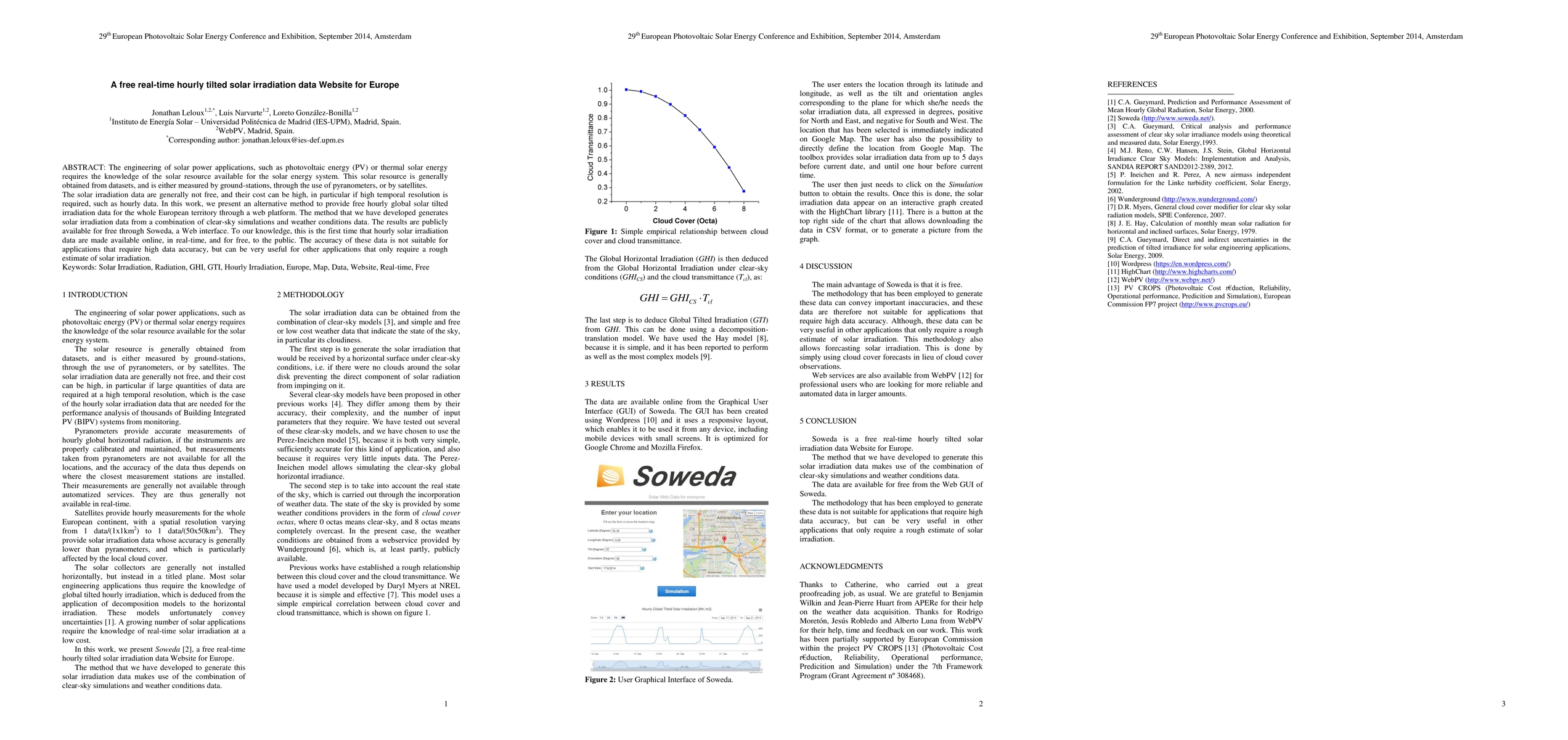 The engineering of solar power applications, such as photovoltaic energy (PV) or thermal solar energy requires the knowledge of the solar resource available for the solar energy system. This solar resource is generally obtained from datasets, and is either measured by ground-stations, through the use of pyranometers, or by satellites. The solar irradiation data are generally not free, and their cost can be high, in particular if high temporal resolution is required, such as hourly data. In this work, we present an alternative method to provide free hourly global solar tilted irradiation data for the whole European territory through a web platform. The method that we have developed generates solar irradiation data from a combination of clear-sky simulations and weather conditions data. The results are publicly available for free through Soweda, a Web interface. To our knowledge, this is the first time that hourly solar irradiance data are made available online, in real-time, and for free, to the public. The accuracy of these data is not suitable for applications that require high data accuracy, but can be very useful for other applications that only require a rough estimate of solar irradiation.