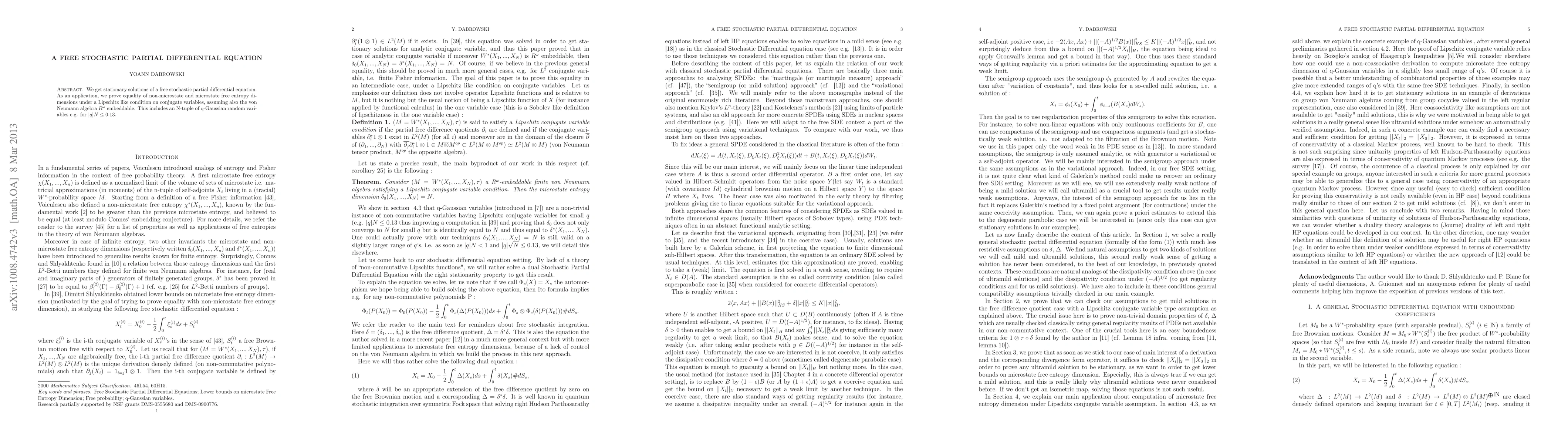 We get stationary solutions of a free stochastic partial differential equation. As an application, we prove equality of non-microstate and microstate free entropy dimensions under a Lipschitz like condition on conjugate variables, assuming also R^\omega\ embeddability. This includes an N-tuple of q-Gaussian random variables e.g. for |q|N\leq 0.13.