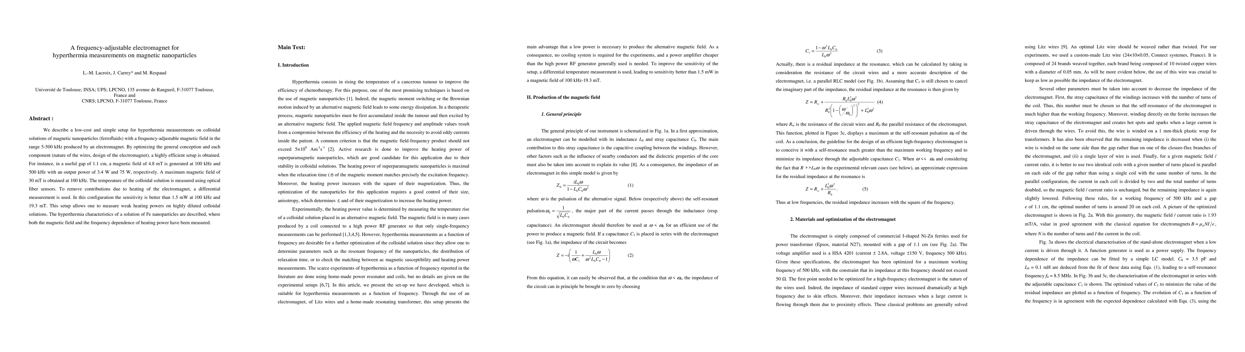 Researchers developed a low-cost electromagnet for measuring hyperthermia in magnetic nanoparticles, achieving high sensitivity and efficiency in detecting weak heating powers. The setup allows for frequency-adjustable magnetic fields, enabling precise measurements of temperature changes in colloidal solutions.