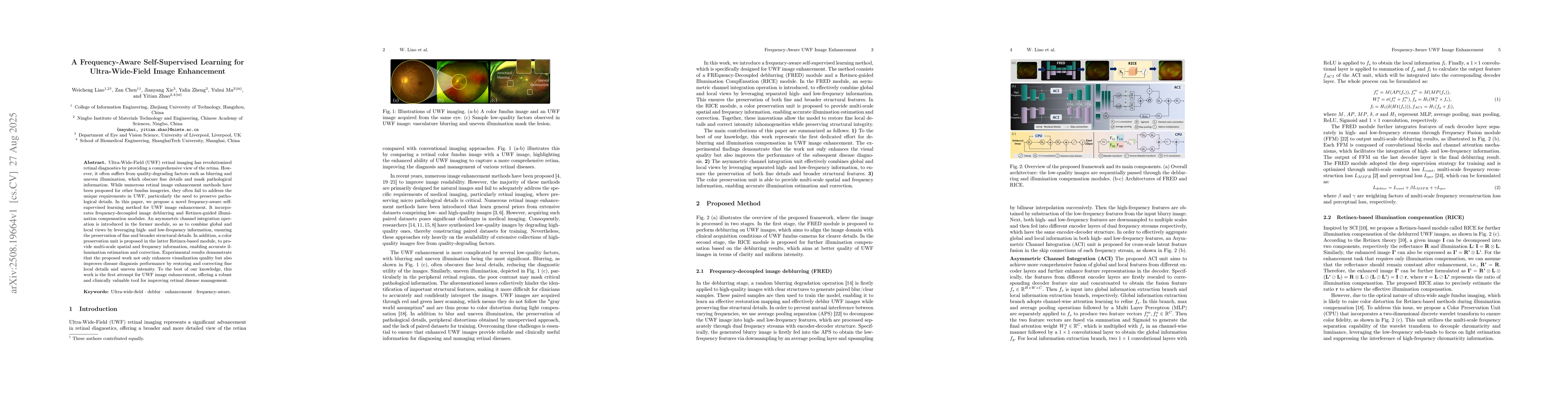 Ultra-Wide-Field (UWF) retinal imaging has revolutionized retinal diagnostics by providing a comprehensive view of the retina. However, it often suffers from quality-degrading factors such as blurring and uneven illumination, which obscure fine details and mask pathological information. While numerous retinal image enhancement methods have been proposed for other fundus imageries, they often fail to address the unique requirements in UWF, particularly the need to preserve pathological details. In this paper, we propose a novel frequency-aware self-supervised learning method for UWF image enhancement. It incorporates frequency-decoupled image deblurring and Retinex-guided illumination compensation modules. An asymmetric channel integration operation is introduced in the former module, so as to combine global and local views by leveraging high- and low-frequency information, ensuring the preservation of fine and broader structural details. In addition, a color preservation unit is proposed in the latter Retinex-based module, to provide multi-scale spatial and frequency information, enabling accurate illumination estimation and correction. Experimental results demonstrate that the proposed work not only enhances visualization quality but also improves disease diagnosis performance by restoring and correcting fine local details and uneven intensity. To the best of our knowledge, this work is the first attempt for UWF image enhancement, offering a robust and clinically valuable tool for improving retinal disease management.