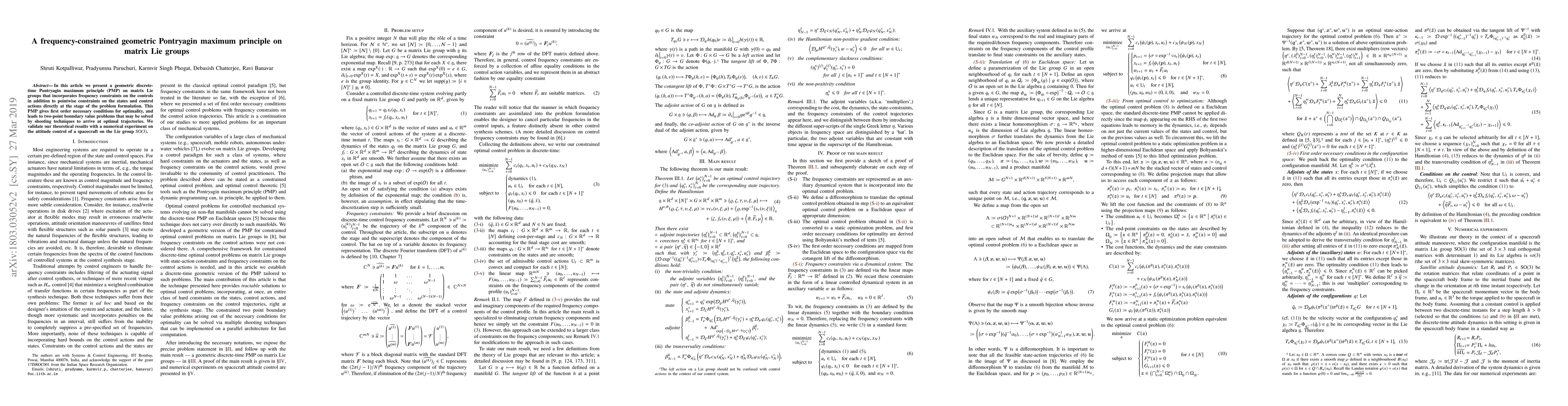 This paper formulates a geometric Pontryagin maximum principle on matrix Lie groups that includes frequency constraints on controls, providing first-order necessary conditions for optimality. The method is validated through a numerical experiment on spacecraft attitude control on the SO(3) Lie group.