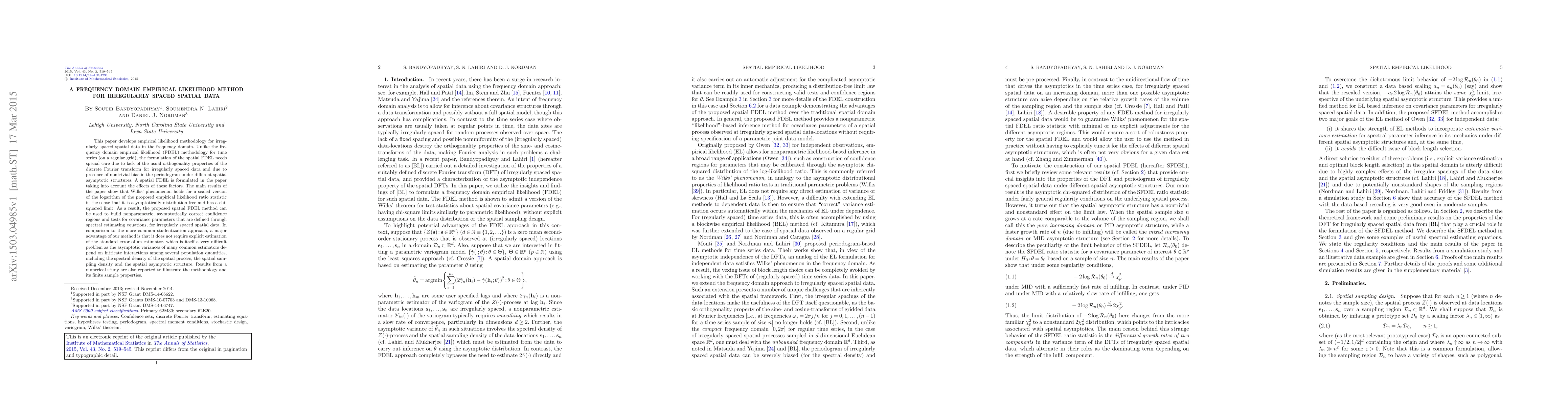 This paper introduces an empirical likelihood methodology for irregularly spaced spatial data in the frequency domain, addressing the lack of orthogonality in Fourier transforms and bias in the periodogram. The proposed spatial frequency domain empirical likelihood (FDEL) method is shown to be asymptotically distribution-free, enabling the construction of nonparametric confidence regions and tests for covariance parameters without requiring explicit standard error estimation.