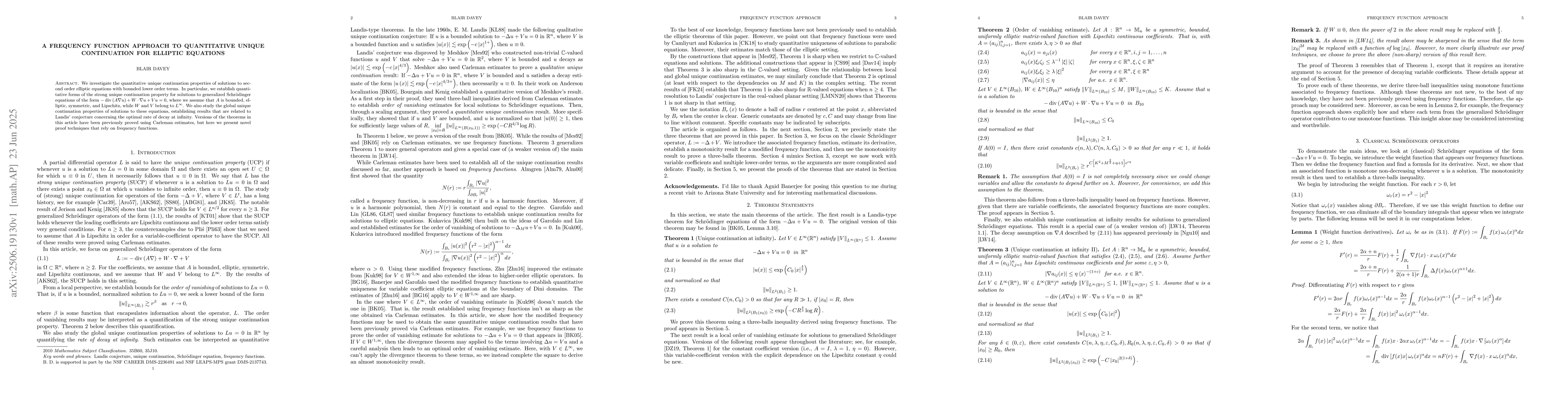 We investigate the quantitative unique continuation properties of solutions to second order elliptic equations with bounded lower order terms. In particular, we establish quantitative forms of the strong unique continuation property for solutions to generalized Schr\"odinger equations of the form $- \nabla \cdot (A \nabla u) + W \cdot \nabla u + V u = 0$, where we assume that $A$ is bounded, elliptic, symmetric, and Lipschitz, while $W$ and $V$ belong to $L^\infty$. We also study the global unique continuation properties of solutions to these equations, establishing results that are related to Landis' conjecture concerning the optimal rate of decay at infinity. Versions of the theorems in this article have been previously proved using Carleman estimates, but here we present novel proof techniques that rely on frequency functions.