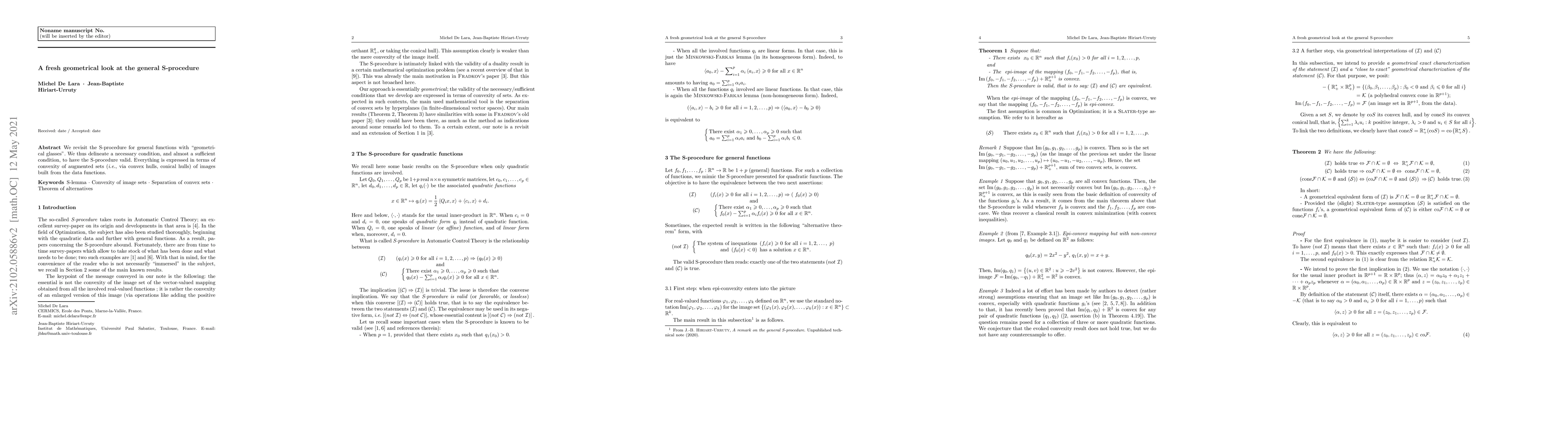 We revisit the S-procedure for general functions with "geometrical glasses". We thus delineate a necessary condition, and almost a sufficient condition, to have the S-procedure valid. Everything is expressed in terms of convexity of augmented sets (convex hulls, conical hulls) of images built from the data functions.