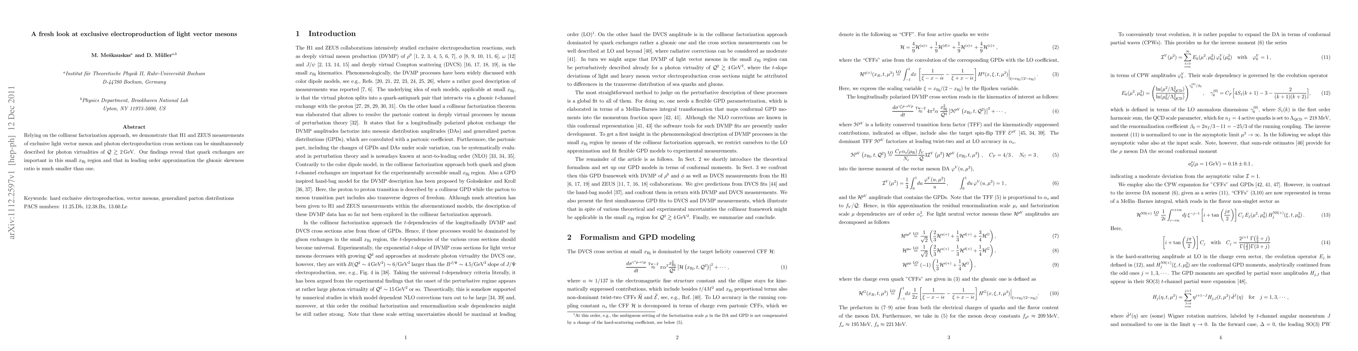 Relying on the collinear factorization approach, we demonstrate that H1 and ZEUS measurements of exclusive light vector meson and photon electroproduction cross sections can be simultaneously described for photon virtualities of $Q >2 GeV$. Our findings reveal that quark exchanges are important in this small $x_{Bj}$ region and that in leading order approximation the gluonic skewness ratio is much smaller than one.