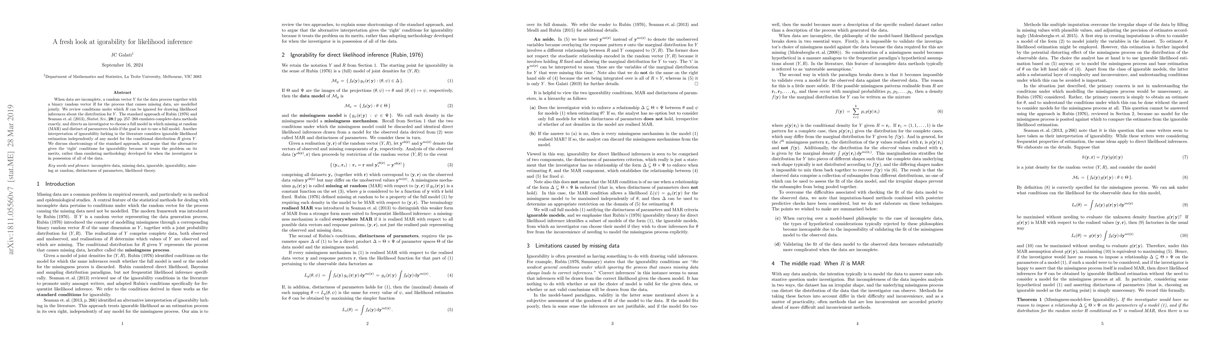 When data are incomplete, a random vector Y for the data process together with a binary random vector R for the process that causes missing data, are modelled jointly. We review conditions under which R can be ignored for drawing likelihood inferences about the distribution for Y. The standard approach of Rubin (1976) and Seaman et. al. (2013) Statist. Sci., 28:2 pp. 257--268 emulates complete-data methods exactly, and directs an investigator to choose a full model in which missing at random (MAR) and distinct of parameters holds if the goal is not to use a full model. Another interpretation of ignorability lurking in the literature considers ignorable likelihood estimation independently of any model for the conditional distribution R given Y. We discuss shortcomings of the standard approach, and argue that the alternative gives the `right' conditions for ignorability because it treats the problem on its merits, rather than emulating methodology developed for when the investigator is in possession of all of the data.