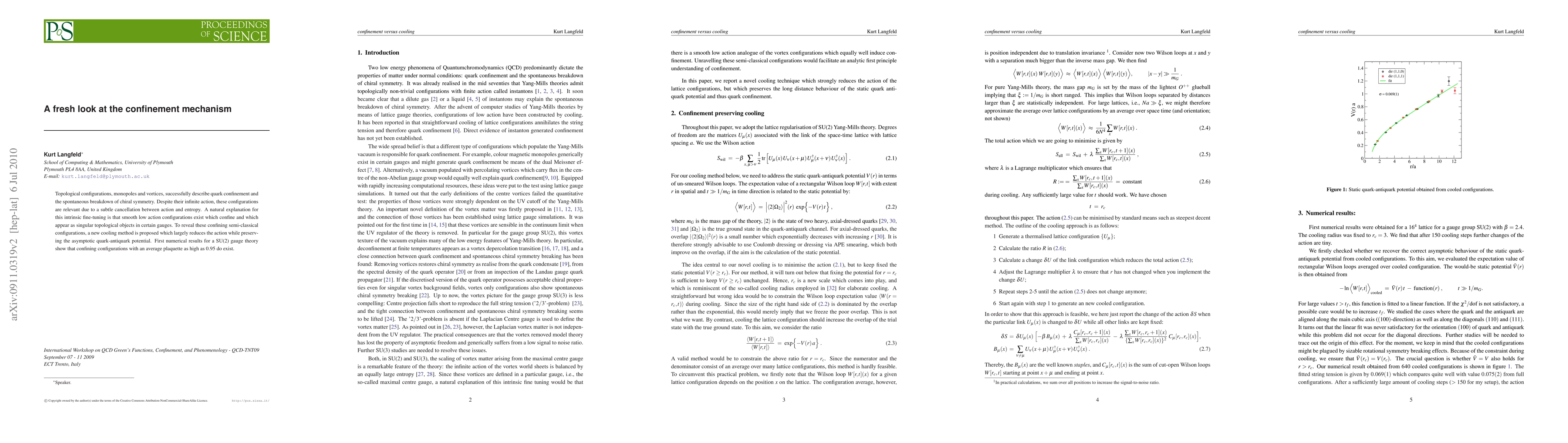 Topological configurations, monopoles and vortices, successfully describe quark confinement and the spontaneous breakdown of chiral symmetry. Despite their infinite action, these configurations are relevant due to a subtle cancellation between action and entropy. A natural explanation for this intrinsic fine-tuning is that smooth low action configurations exist which confine and which appear as singular topological objects in certain gauges. To reveal these confining semi-classical configurations, a new cooling method is proposed which largely reduces the action while preserving the asymptotic quark-antiquark potential. First numerical results for a SU(2) gauge theory show that confining configurations with an average plaquette as high as 0.95 do exist.