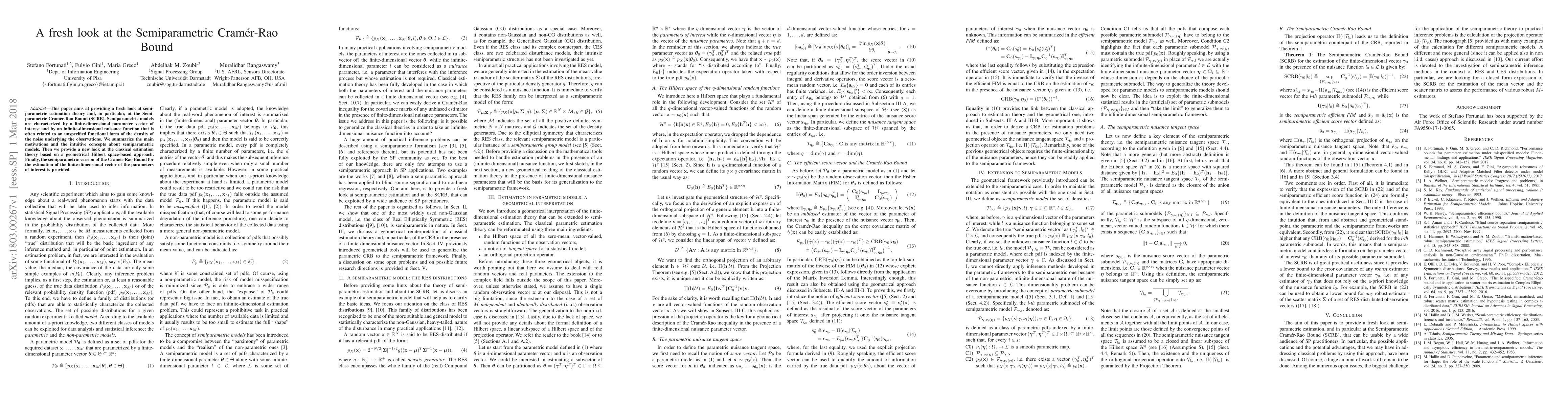 This paper aims at providing a fresh look at semiparametric estimation theory and, in particular, at the Semiparametric Cram\'{e}r-Rao Bound (SCRB). Semiparametric models are characterized by a finite-dimensional parameter vector of interest and by an infinite-dimensional nuisance function that is often related to an unspecified functional form of the density of the noise underlying the observations. We summarize the main motivations and the intuitive concepts about semiparametric models. Then we provide a new look at the classical estimation theory based on a geometrical Hilbert space-based approach. Finally, the semiparametric version of the Cram\'{e}r-Rao Bound for the estimation of the finite-dimensional vector of the parameters of interest is provided.