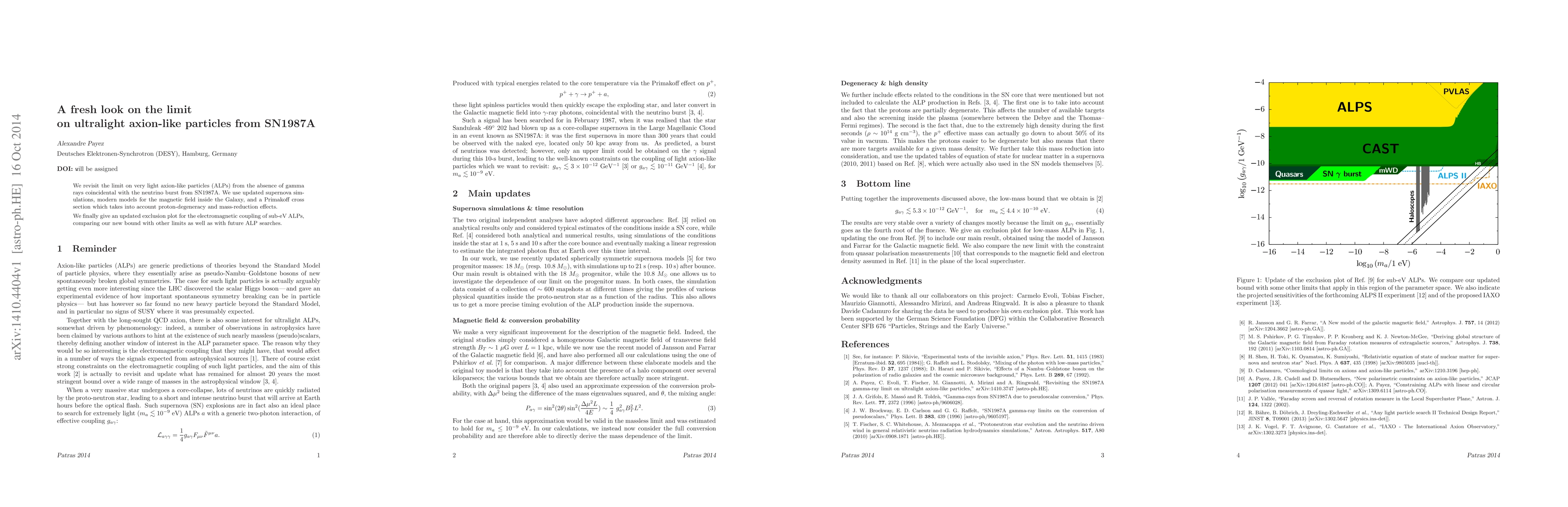 We revisit the limit on very light axion-like particles (ALPs) from the absence of gamma rays coincidental with the neutrino burst from SN1987A. We use updated supernova simulations, modern models for the magnetic field inside the Galaxy, and a Primakoff cross section which takes into account proton-degeneracy and mass-reduction effects. We finally give an updated exclusion plot for the electromagnetic coupling of sub-eV ALPs, comparing our new bound with other limits as well as with future ALP searches.