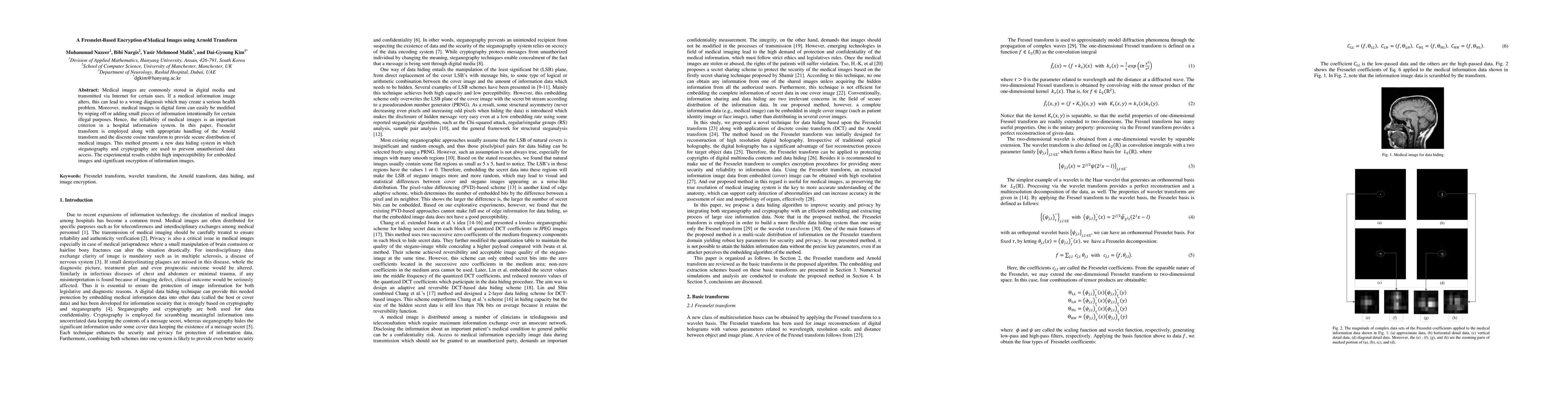 This paper proposes a secure encryption method for medical images using Fresnelet transform combined with Arnold transform and discrete cosine transform. The approach integrates steganography and cryptography to ensure high imperceptibility and strong encryption, safeguarding against unauthorized access and modifications.