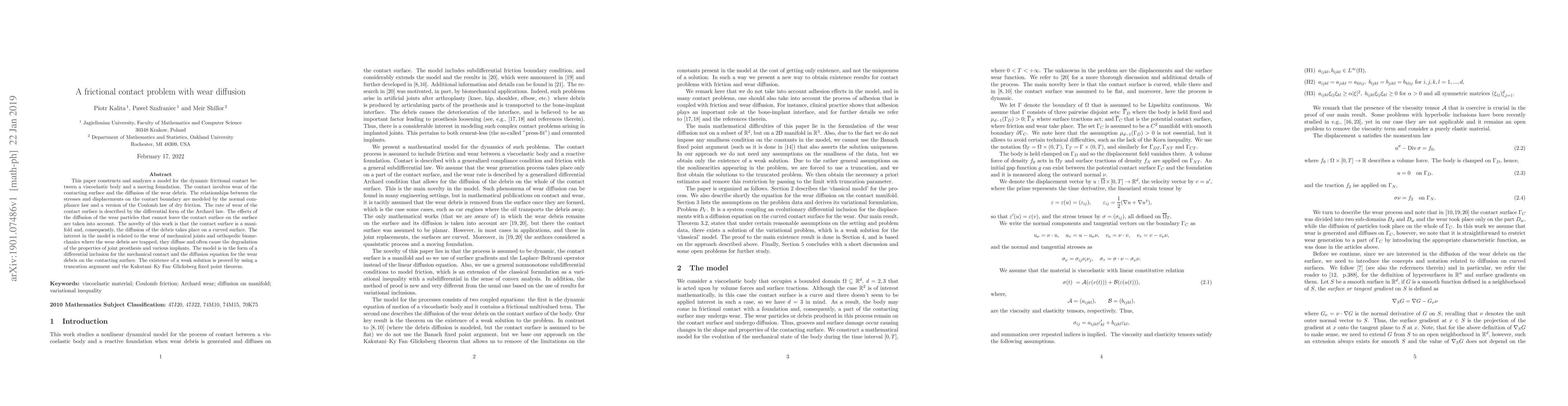 This paper develops a model for dynamic frictional contact between a viscoelastic body and a moving foundation with wear diffusion, focusing on the degradation of joint prosthetics and implants. The existence of a weak solution is proved using a truncation argument and fixed point theorem.