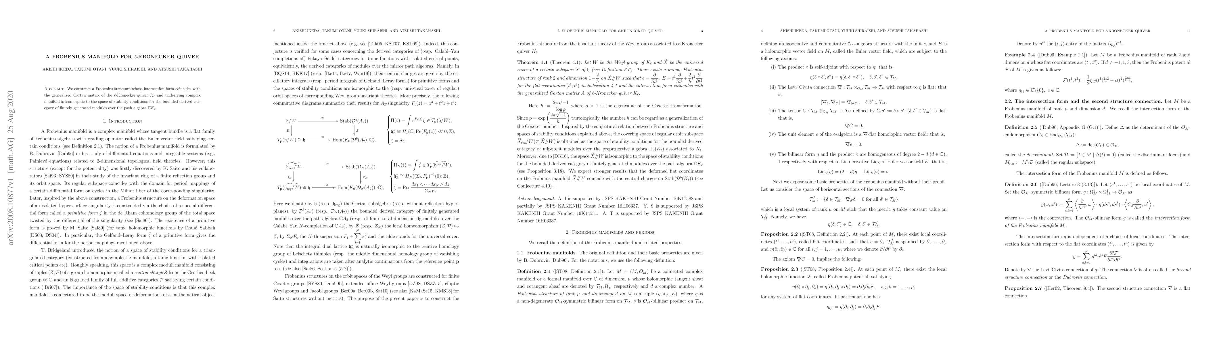 Summary: The paper constructs a Frobenius manifold associated with the $\ell$-Kronecker quiver, aligning its intersection form with the generalized Cartan matrix, and demonstrates its isomorphism to the space of stability conditions for the derived category of $\mathbb{C} K_{\ell}$ modules.