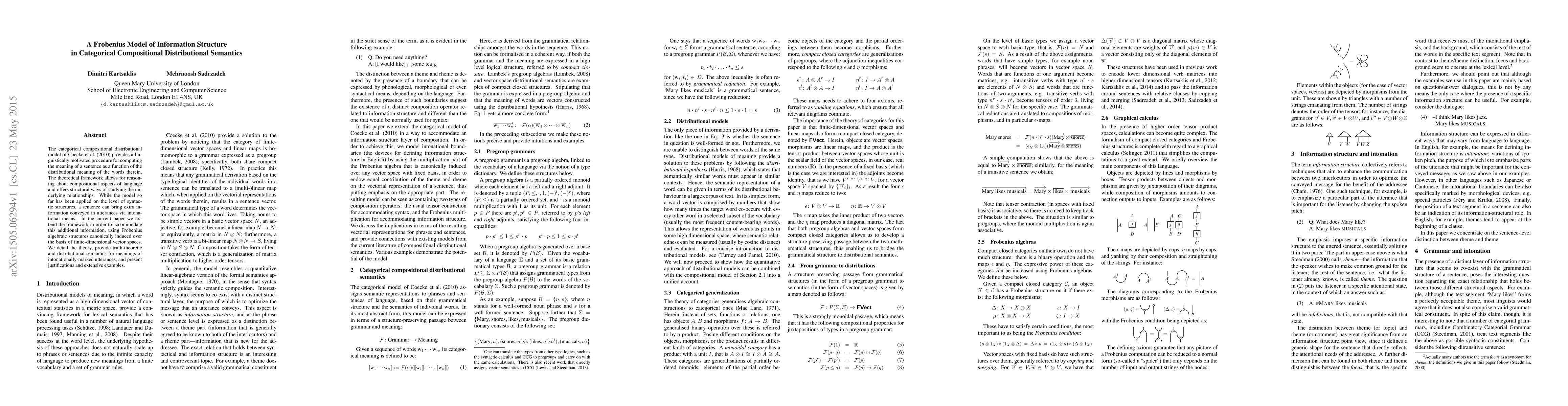This paper extends the categorical compositional distributional model to incorporate intonational information, utilizing Frobenius algebraic structures. It provides theoretical foundations, semantics for intonationally marked meanings, and supports the framework with examples and justifications.