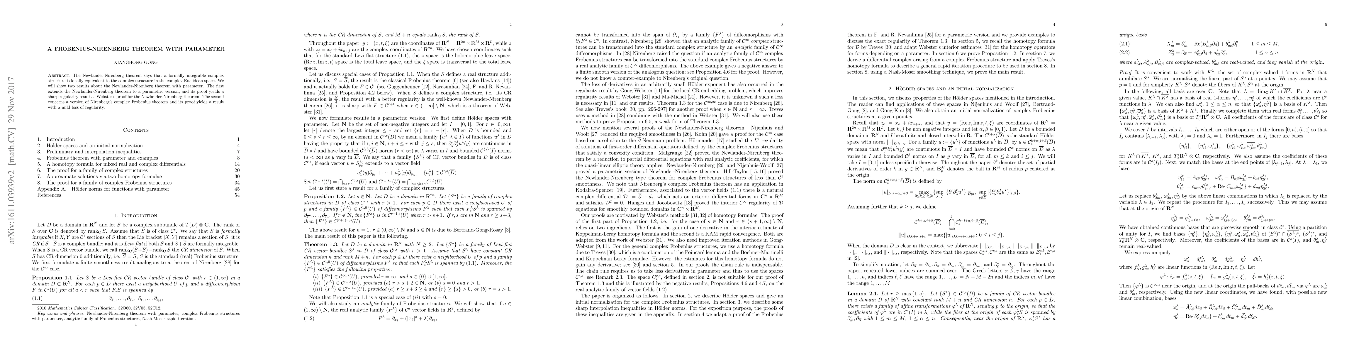 This paper extends the Newlander-Nirenberg theorem to a parametric version, achieving sharp regularity results akin to Webster's proof, and also presents a version of Nirenberg's complex Frobenius theorem with a slight loss of regularity.