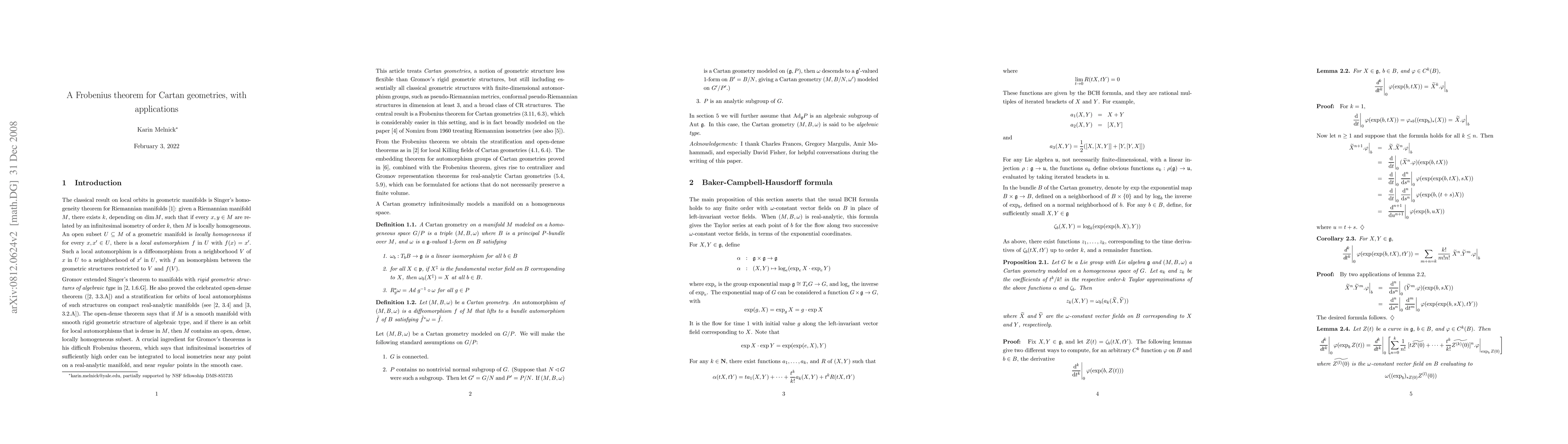 This paper proves Frobenius theorem analogues for Cartan geometries, showing that infinitesimal automorphisms integrate to local ones, leading to a stratification of orbits and an open-dense theorem in the smooth case. It also relates the manifold's fundamental group to its automorphism group via embedding techniques.
