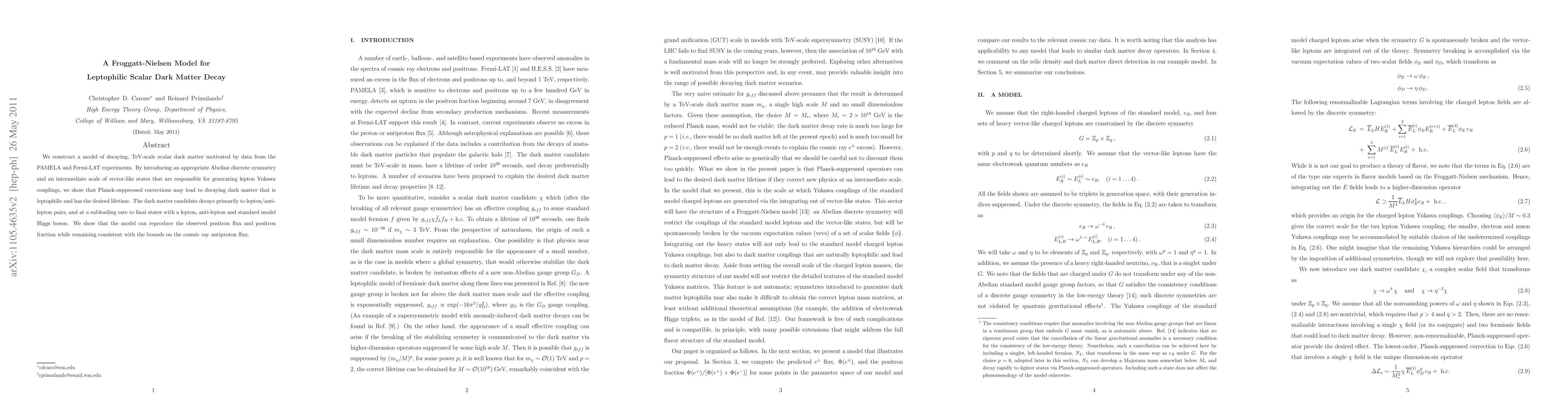 We construct a model of decaying, TeV-scale scalar dark matter motivated by data from the PAMELA and Fermi-LAT experiments. By introducing an appropriate Abelian discrete symmetry and an intermediate scale of vector-like states that are responsible for generating lepton Yukawa couplings, we show that Planck-suppressed corrections may lead to decaying dark matter that is leptophilic and has the desired lifetime. The dark matter candidate decays primarily to lepton/anti-lepton pairs, and at a subleading rate to final states with a lepton, anti-lepton and standard model Higgs boson. We show that the model can reproduce the observed positron flux and positron fraction while remaining consistent with the bounds on the cosmic ray antiproton flux.
