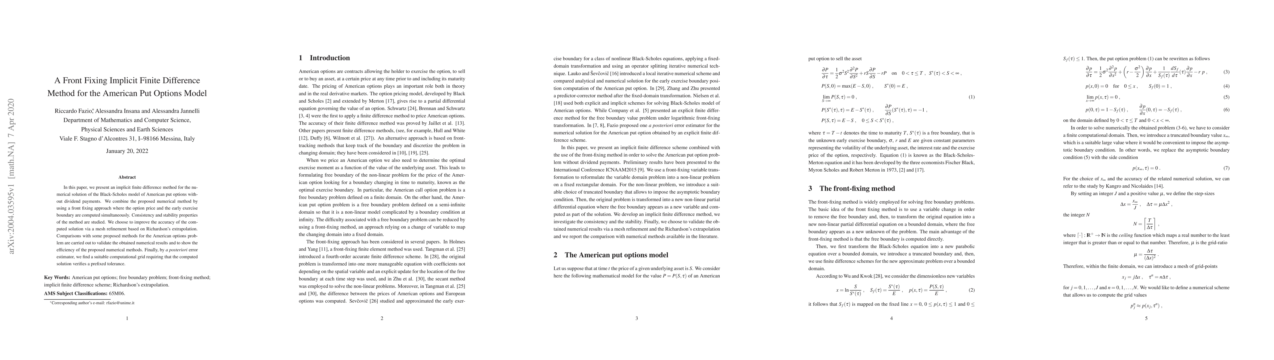 This paper introduces an implicit finite difference method for solving the Black-Scholes model of American put options, employing a front fixing approach to compute both the option price and early exercise boundary simultaneously. The method's accuracy is enhanced through mesh refinement and validated against other methods, demonstrating its efficiency.