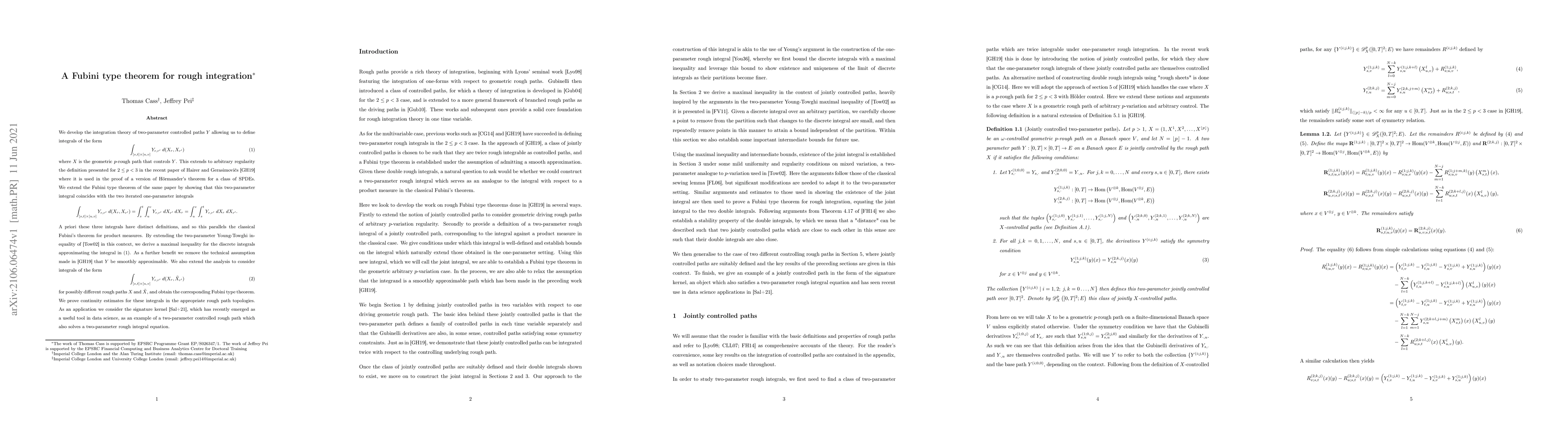We develop the integration theory of two-parameter controlled paths $Y$ allowing us to define integrals of the form \begin{equation} \int_{[s,t] \times [u,v]} Y_{r,r'} \;d(X_{r}, X_{r'}) \end{equation} where $X$ is the geometric $p$-rough path that controls $Y$. This extends to arbitrary regularity the definition presented for $2\leq p<3$ in the recent paper of Hairer and Gerasimovi\v{c}s where it is used in the proof of a version of H\"{o}rmander's theorem for a class of SPDEs. We extend the Fubini type theorem of the same paper by showing that this two-parameter integral coincides with the two iterated one-parameter integrals \[ \int_{[s,t] \times [u,v]} Y_{r,r'} \;d(X_{r}, X_{r'}) = \int_{s}^{t} \int_{u}^{v} Y_{r,r'} \;dX_{r'} \;dX_{r'} = \int_{u}^{v} \int_{s}^{t} Y_{r,r'} \;dX_{r} \;dX_{r'}. \] A priori these three integrals have distinct definitions, and so this parallels the classical Fubini's theorem for product measures. By extending the two-parameter Young-Towghi inequality in this context, we derive a maximal inequality for the discrete integrals approximating the two-parameter integral. We also extend the analysis to consider integrals of the form \begin{equation*} \int_{[s,t] \times [u,v]} Y_{r,r'} \; d(X_{r}, \tilde{X}_{r'}) \end{equation*} for possibly different rough paths $X$ and $\tilde{X}$, and obtain the corresponding Fubini type theorem. We prove continuity estimates for these integrals in the appropriate rough path topologies. As an application we consider the signature kernel, which has recently emerged as a useful tool in data science, as an example of a two-parameter controlled rough path which also solves a two-parameter rough integral equation.