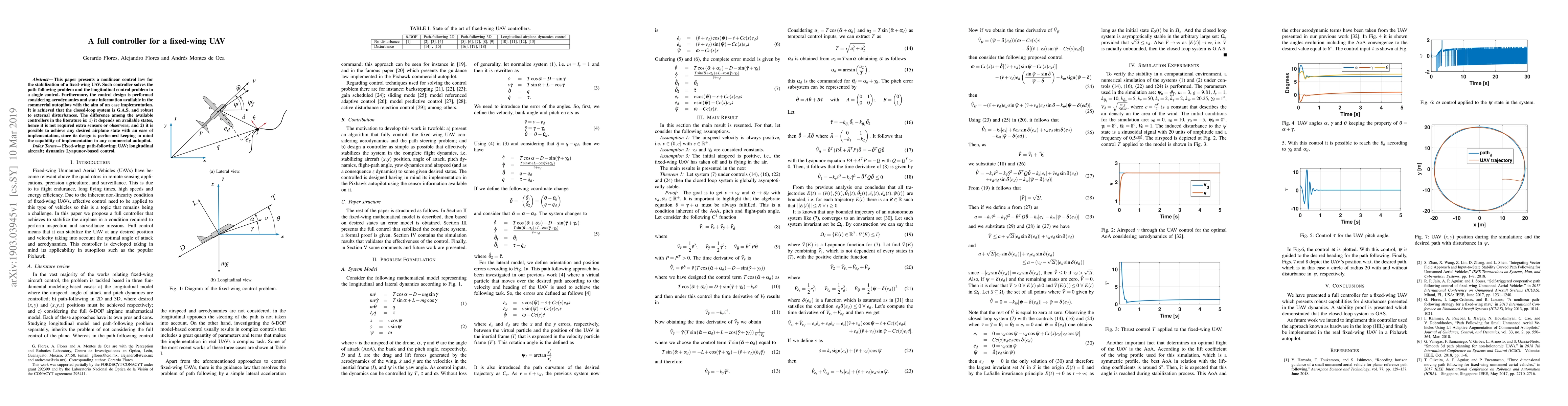 This paper presents a nonlinear control law for the stabilization of a fixed-wing UAV. Such controller solves the path-following problem and the longitudinal control problem in a single control. Furthermore, the control design is performed considering aerodynamics and state information available in the commercial autopilots with the aim of an ease implementation. It is achieved that the closed-loop system is G.A.S. and robust to external disturbances. The difference among the available controllers in the literature is: 1) it depends on available states, hence it is not required extra sensors or observers; and 2) it is possible to achieve any desired airplane state with an ease of implementation, since its design is performed keeping in mind the capability of implementation in any commercial autopilot.