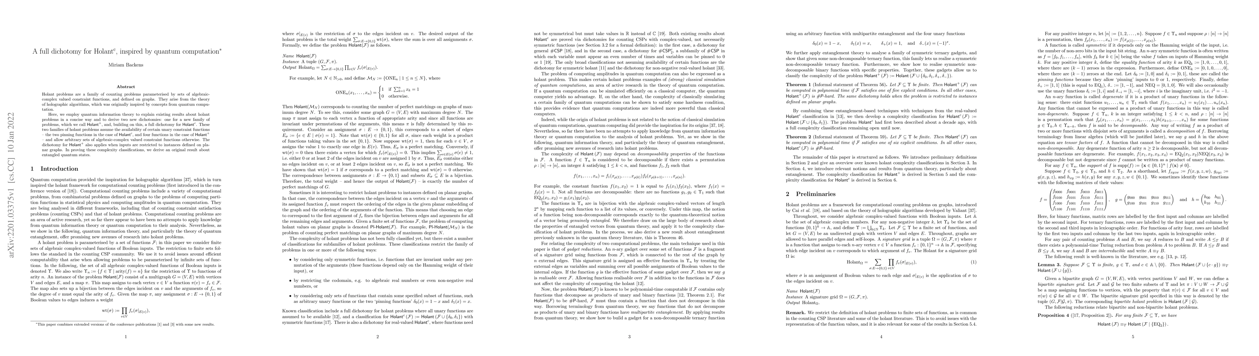 Holant problems are a family of counting problems parameterised by sets of algebraic-complex valued constraint functions, and defined on graphs. They arise from the theory of holographic algorithms, which was originally inspired by concepts from quantum computation. Here, we employ quantum information theory to explain existing results about holant problems in a concise way and to derive two new dichotomies: one for a new family of problems, which we call Holant$^+$, and, building on this, a full dichotomy for Holant$^c$. These two families of holant problems assume the availability of certain unary constraint functions -- the two pinning functions in the case of Holant$^c$, and four functions in the case of Holant$^+$ -- and allow arbitrary sets of algebraic-complex valued constraint functions otherwise. The dichotomy for Holant$^+$ also applies when inputs are restricted to instances defined on planar graphs. In proving these complexity classifications, we derive an original result about entangled quantum states.