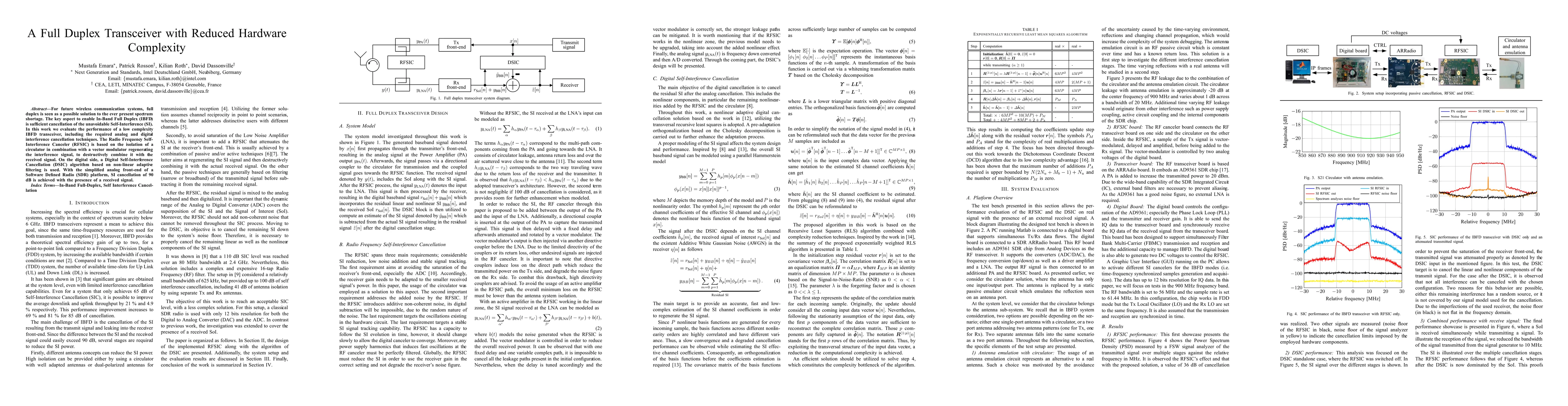 For future wireless communication systems, full duplex is seen as a possible solution to the ever present spectrum shortage. The key aspect to enable In-Band Full Duplex (IBFD) is sufficient cancellation of the unavoidable Self-Interference (SI). In this work we evaluate the performance of a low complexity IBFD transceiver, including the required analog and digital interference cancellation techniques. The Radio Frequency Self- Interference Canceler (RFSIC) is based on the isolation of a circulator in combination with a vector modulator regenerating the interference signal, to destructively combine it with the received signal. On the digital side, a Digital Self-Interference Cancellation (DSIC) algorithm based on non-linear adaptive filtering is used. With the simplified analog front-end of a Software Defined Radio (SDR) platform, SI cancellation of 90 dB is achieved with the presence of a received signal.