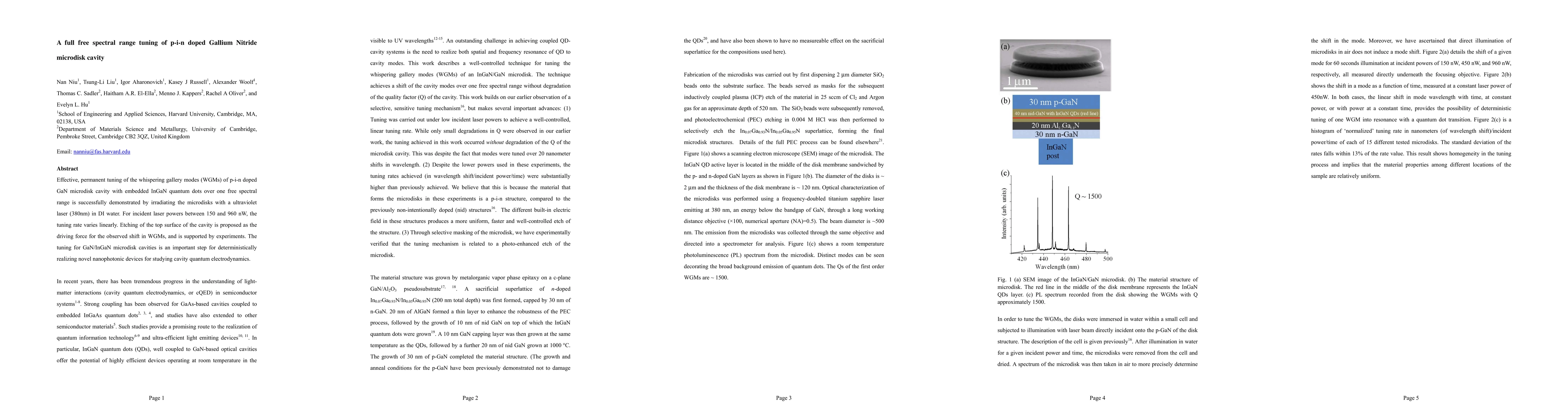 This research demonstrates effective tuning of the whispering gallery modes in p-i-n doped GaN microdisk cavities using ultraviolet laser irradiation in water, achieving full free spectral range adjustment. The tuning is attributed to the etching of the cavity's top surface and paves the way for novel nanophotonic devices.