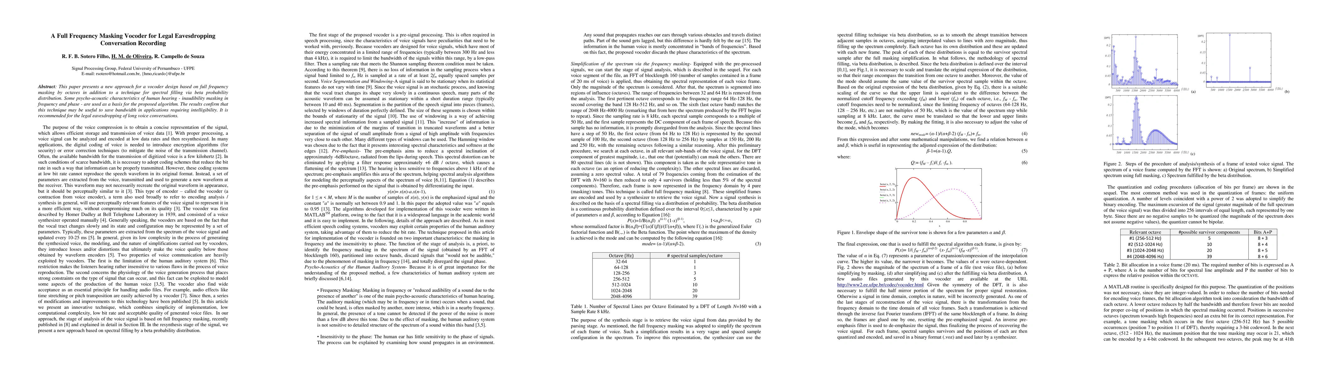 This paper presents a new approach for a vocoder design based on full frequency masking by octaves in addition to a technique for spectral filling via beta probability distribution. Some psycho-acoustic characteristics of human hearing - inaudibility masking in frequency and phase - are used as a basis for the proposed algorithm. The results confirm that this technique may be useful to save bandwidth in applications requiring intelligibility. It is recommended for the legal eavesdropping of long voice conversations.