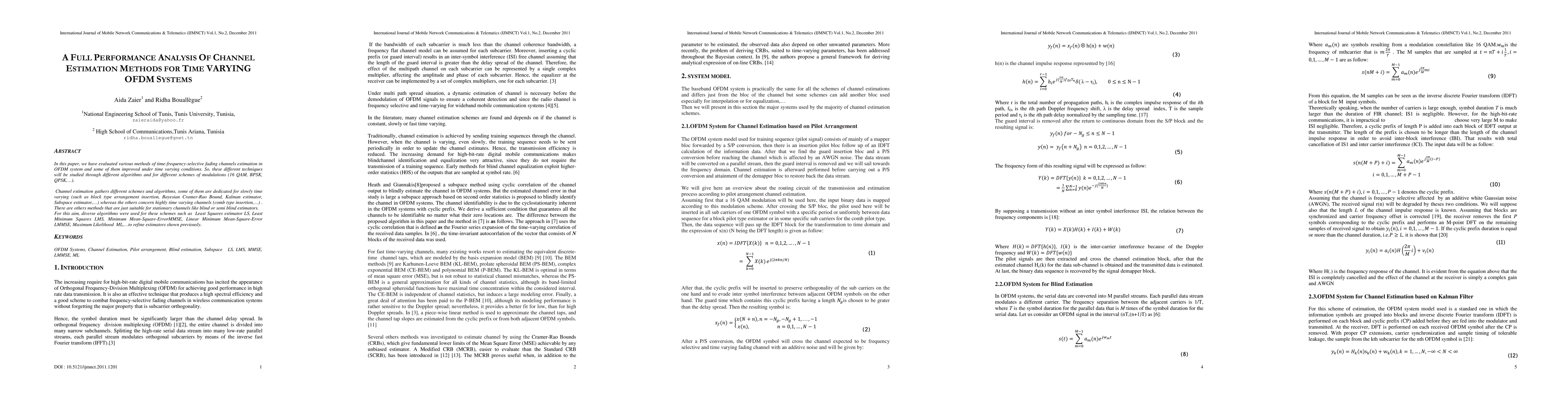 This paper evaluates various channel estimation methods for time-varying OFDM systems, comparing techniques for different modulation schemes and time-selectivity conditions, including block and comb type arrangements, Bayesian, Kalman, and subspace estimators, and refining them using algorithms like LS, LMS, MMSE, LMMSE, and ML.