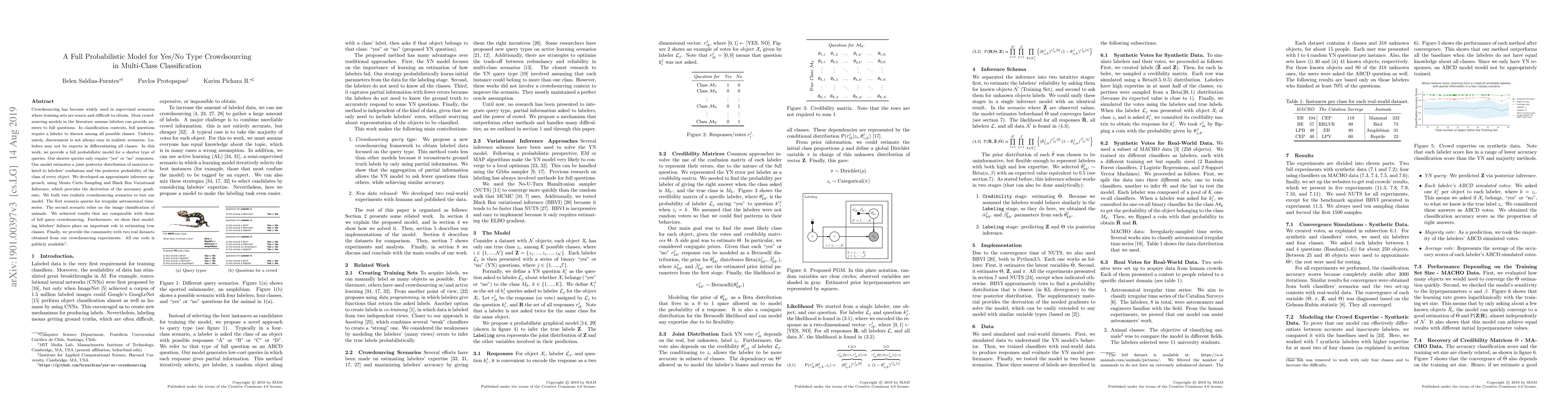 Crowdsourcing has become widely used in supervised scenarios where training sets are scarce and difficult to obtain. Most crowdsourcing models in the literature assume labelers can provide answers to full questions. In classification contexts, full questions require a labeler to discern among all possible classes. Unfortunately, discernment is not always easy in realistic scenarios. Labelers may not be experts in differentiating all classes. In this work, we provide a full probabilistic model for a shorter type of queries. Our shorter queries only require "yes" or "no" responses. Our model estimates a joint posterior distribution of matrices related to labelers' confusions and the posterior probability of the class of every object. We developed an approximate inference approach, using Monte Carlo Sampling and Black Box Variational Inference, which provides the derivation of the necessary gradients. We built two realistic crowdsourcing scenarios to test our model. The first scenario queries for irregular astronomical time-series. The second scenario relies on the image classification of animals. We achieved results that are comparable with those of full query crowdsourcing. Furthermore, we show that modeling labelers' failures plays an important role in estimating true classes. Finally, we provide the community with two real datasets obtained from our crowdsourcing experiments. All our code is publicly available.