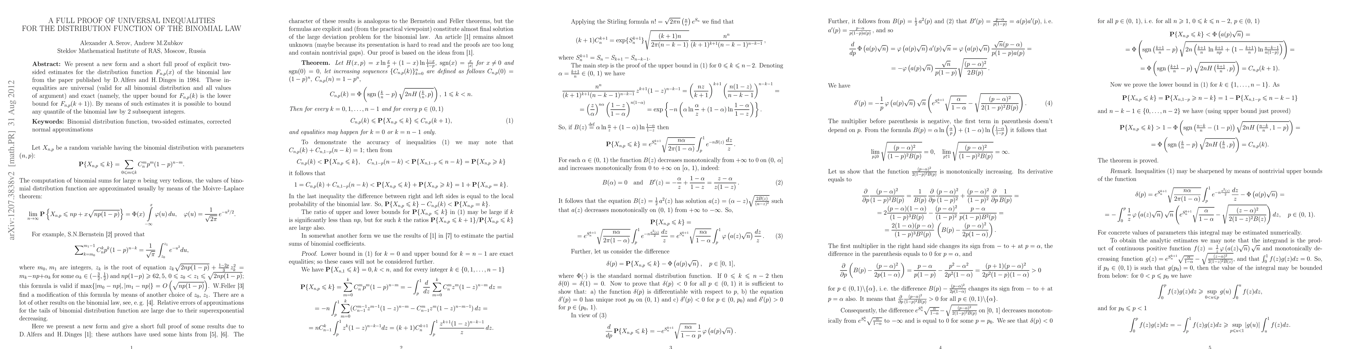 We present a new form and a short full proof of explicit two-sided estimates for the distribution function F_{n,p}(x) of the binomial law from the paper published by D.Alfers and H.Dinges in 1984. These inequalities are universal (valid for all binomial distribution and all values of argument) and exact (namely, the upper bound for F_{n,p}(k) is the lower bound for F_{n,p}(k+1)). By means of such estimates it is possible to bound any quantile of the binomial law by 2 subsequent integers.