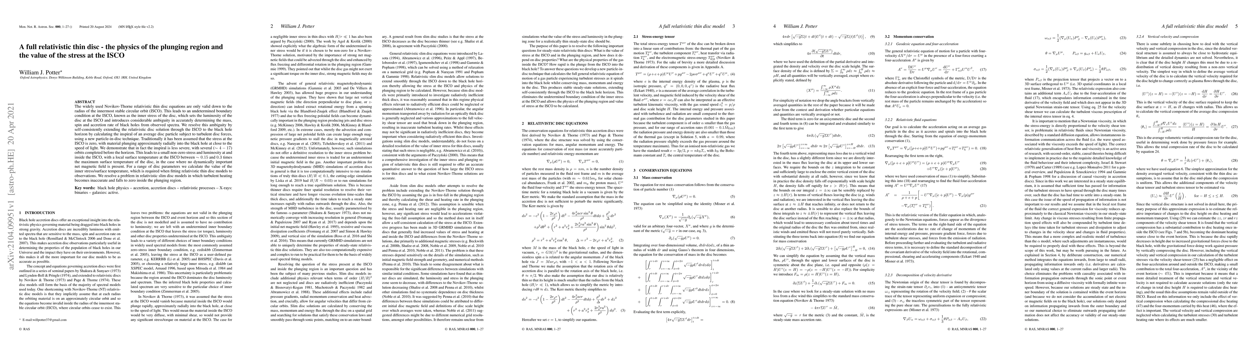 The widely used Novikov-Thorne relativistic thin disc equations are only valid down to the radius of the innermost stable circular orbit (ISCO). This leads to an undetermined boundary condition at the ISCO, known as the inner stress of the disc, which sets the luminosity of the disc at the ISCO and introduces considerable ambiguity in accurately determining the mass, spin and accretion rate of black holes from observed spectra. We resolve this ambiguity by self-consistently extending the relativistic disc solution through the ISCO to the black hole horizon by calculating the inspiral of an average disc particle subject to turbulent disc forces, using a new particle-in-disc technique. Traditionally it has been assumed that the stress at the ISCO is zero, with material plunging approximately radially into the black hole at close to the speed of light. We demonstrate that in fact the inspiral is less severe, with several (~4-17) orbits completed before the horizon. This leads to a small non-zero stress and luminosity at and inside the ISCO, with a local surface temperature at the ISCO between ~0.15 and 0.3 times the maximum surface temperature of the disc, in the case where no dynamically important net magnetic field is present. For a range of disc parameters we calculate the value of the inner stress/surface temperature, which is required when fitting relativistic thin disc models to observations. We resolve a problem in relativistic slim disc models in which turbulent heating becomes inaccurate and falls to zero inside the plunging region.