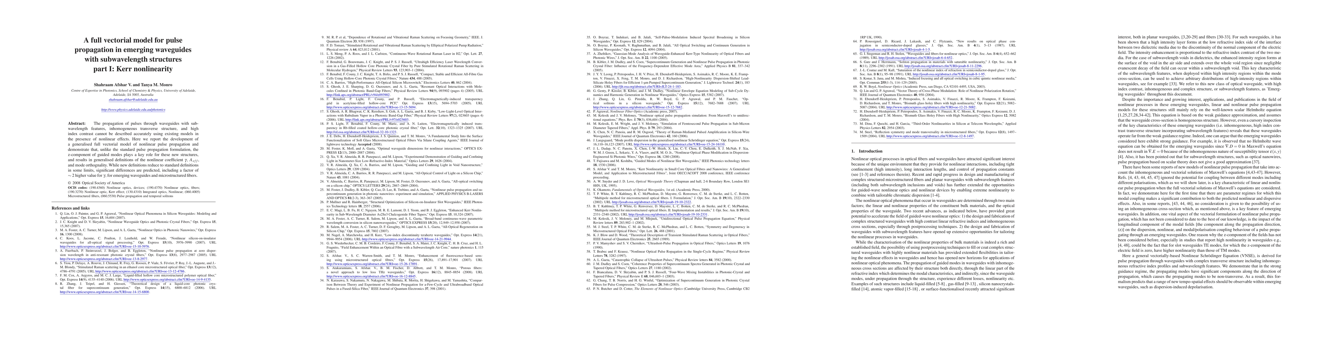 This paper develops a full vectorial model for nonlinear pulse propagation in emerging waveguides with subwavelength structures, highlighting the importance of the z-component of guided modes. It introduces new definitions for nonlinear coefficient $\gamma$, effective area $A_{eff}$, and mode orthogonality, predicting significant differences in these parameters compared to standard models.