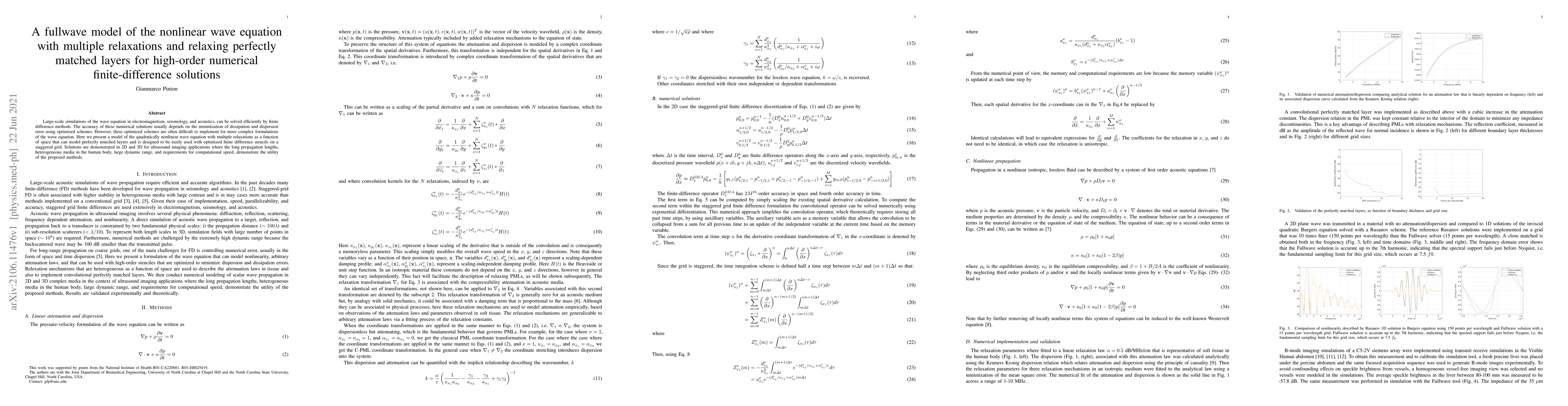 Large-scale simulations of the wave equation in electromagnetism, seismology, and acoustics, can be solved efficiently by finite difference methods. The accuracy of these numerical solutions usually depends on the minimization of dissipation and dispersion error using optimized schemes. However, these optimized schemes are often difficult to implement for more complex formulations of the wave equation. Here we present a model of the quadratically nonlinear wave equation with multiple relaxations as a function of space that can model perfectly matched layers and is designed to be easily used with optimized finite-difference stencils on a staggered grid. Solutions are demonstrated in 2D and 3D for ultrasound imaging applications where the long propagation lengths, heterogeneous media in the human body, large dynamic range, and requirements for computational speed, demonstrate the utility of the proposed methods.