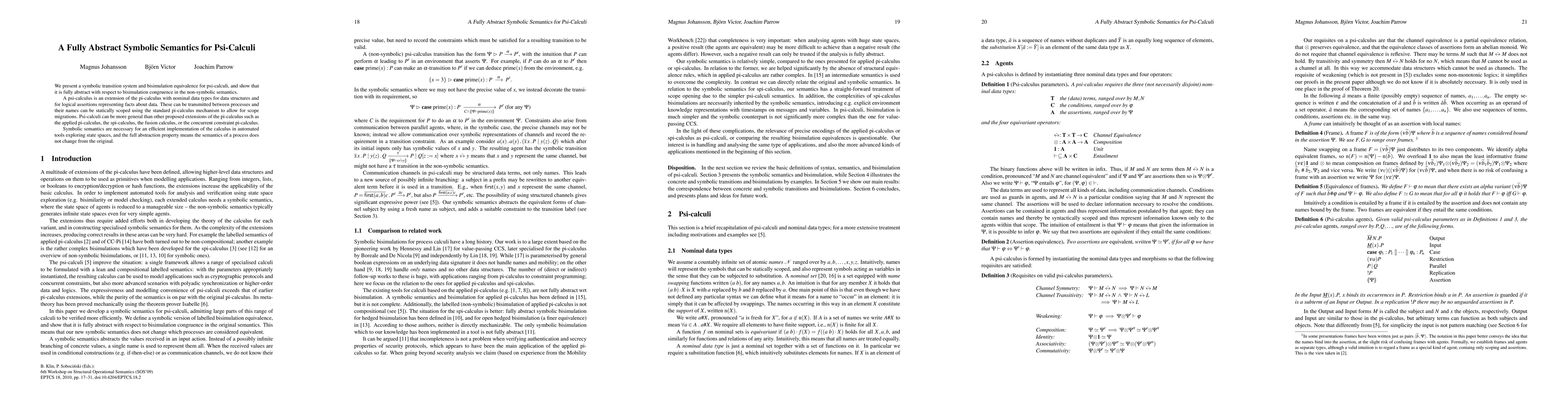 This paper introduces a symbolic transition system and bisimulation equivalence for psi-calculi, demonstrating its full abstraction relative to non-symbolic semantics. The psi-calculus extends pi-calculus to incorporate nominal data types and logical assertions, offering greater generality compared to other extensions.