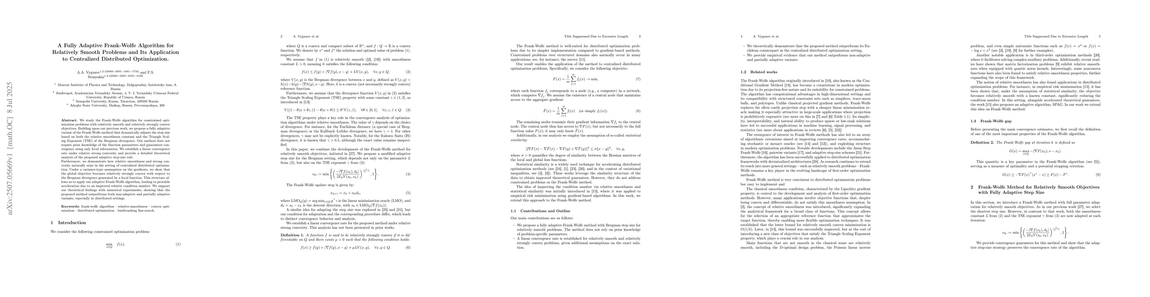 We study the Frank-Wolfe algorithm for constrained optimization problems with relatively smooth and relatively strongly convex objectives. Building upon our previous work, we propose a fully adaptive variant of the Frank-Wolfe method that dynamically adjusts the step size based on both the relative smoothness constant and the Triangle Scaling Exponent (TSE) of the Bregman divergence. Our method does not require prior knowledge of the function parameters and guarantees convergence using only local information. We establish a linear convergence rate under relative strong convexity and provide a detailed theoretical analysis of the proposed adaptive step-size rule. Furthermore, we demonstrate how relative smoothness and strong convexity naturally arise in the setting of centralized distributed optimization. Under a variance-type assumption on the gradients, we show that the global objective becomes relatively strongly convex with respect to the Bregman divergence generated by a local function. This structure allows us to apply our adaptive Frank-Wolfe algorithm, leading to provable acceleration due to an improved relative condition number. We support our theoretical findings with numerical experiments, showing that the proposed method outperforms both non-adaptive and partially adaptive variants, especially in distributed settings.