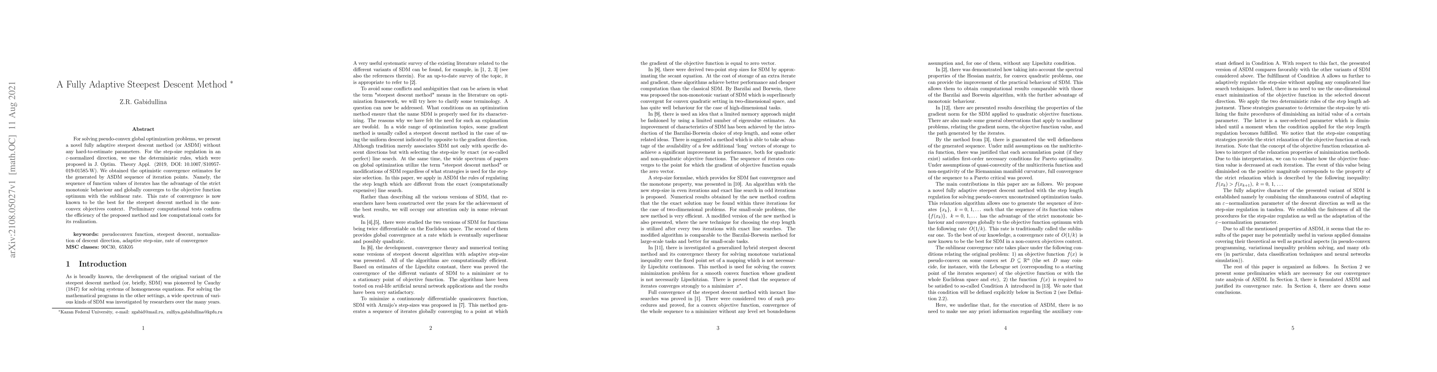 The paper introduces a fully adaptive steepest descent method (ASDM) for solving pseudo-convex global optimization problems without requiring hard-to-estimate parameters, achieving optimal sublinear convergence rates. Preliminary tests show its efficiency and low computational costs.