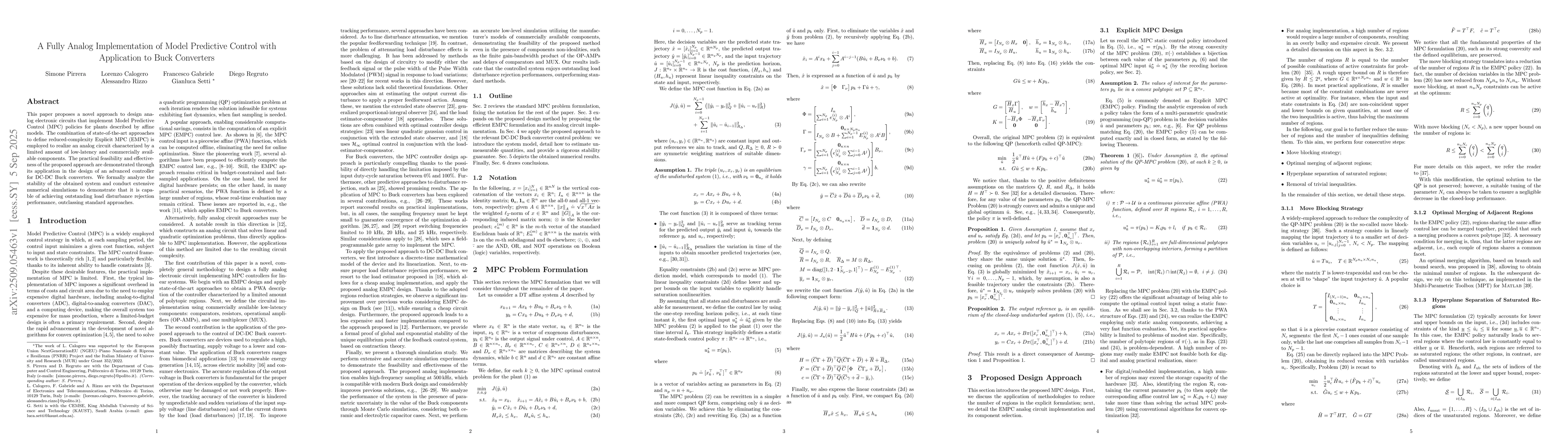 This paper proposes a novel approach to design analog electronic circuits that implement Model Predictive Control (MPC) policies for plants described by affine models. The combination of state-of-the-art approaches to define reduced-complexity Explicit MPC (EMPC) is employed to realize an analog circuit characterized by a limited amount of low-latency and commercially available components. The practical feasibility and effectiveness of the proposed approach are demonstrated through its application in the design of an advanced controller for DC-DC Buck converters. We formally analyze the stability of the obtained system and conduct extensive numerical simulations to demonstrate that it is capable of achieving outstanding load disturbance rejection performance, outclassing standard approaches.